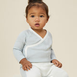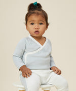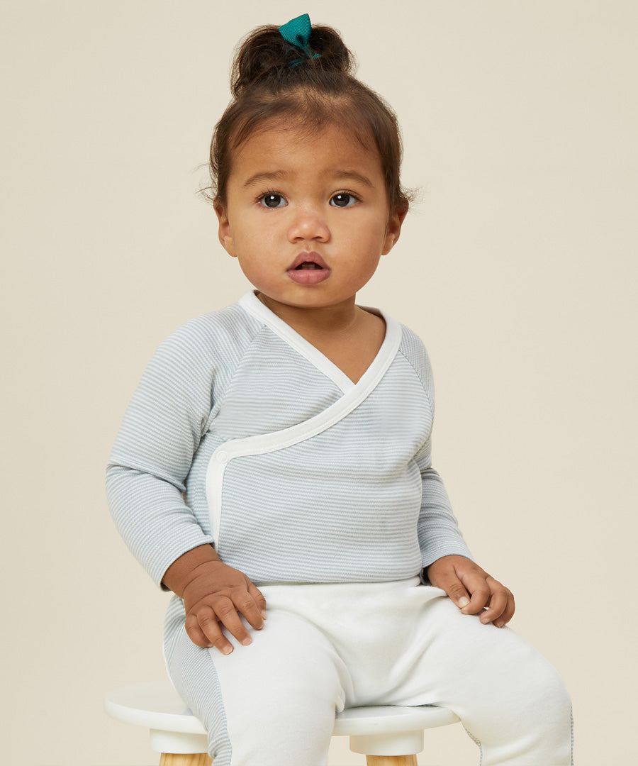 MORI baby kimono bodysuit. 100% organic cotton wrap-style front kimono in blue and white stripe with white trim. Features poppers at the crotch for easy fitting