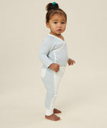 A toddler wearing the Mori organic cotton and bamboo kimono bodysuit in a blue stripe design, with some blue stripe joggers.