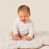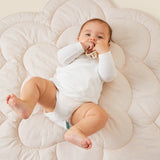 A little baby laying on a flower-shaped mat, wearing the Mori organic kimono baby bodysuit in white.