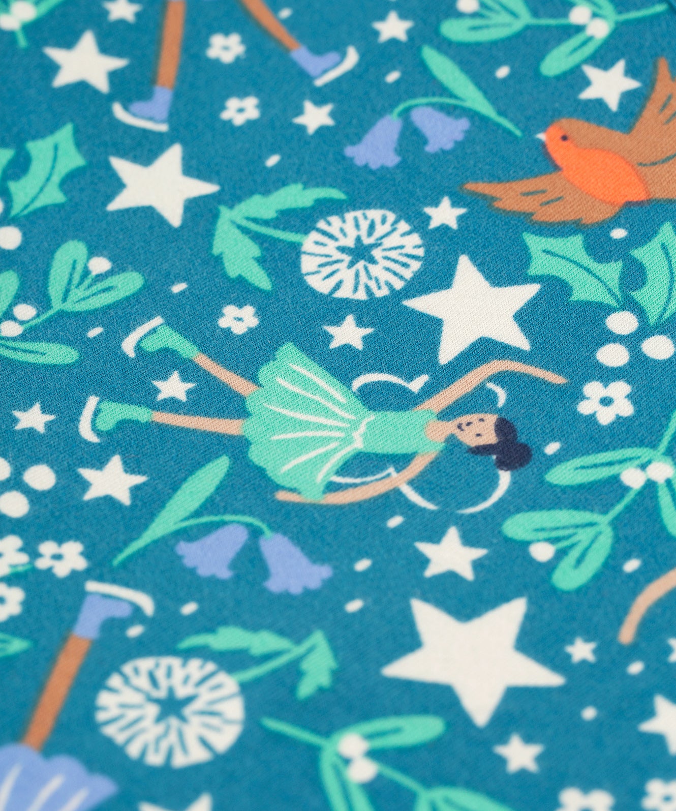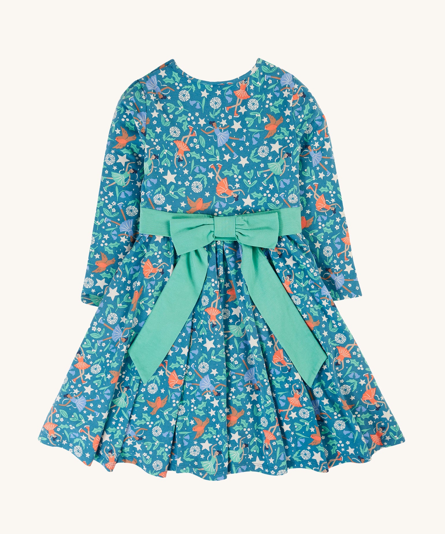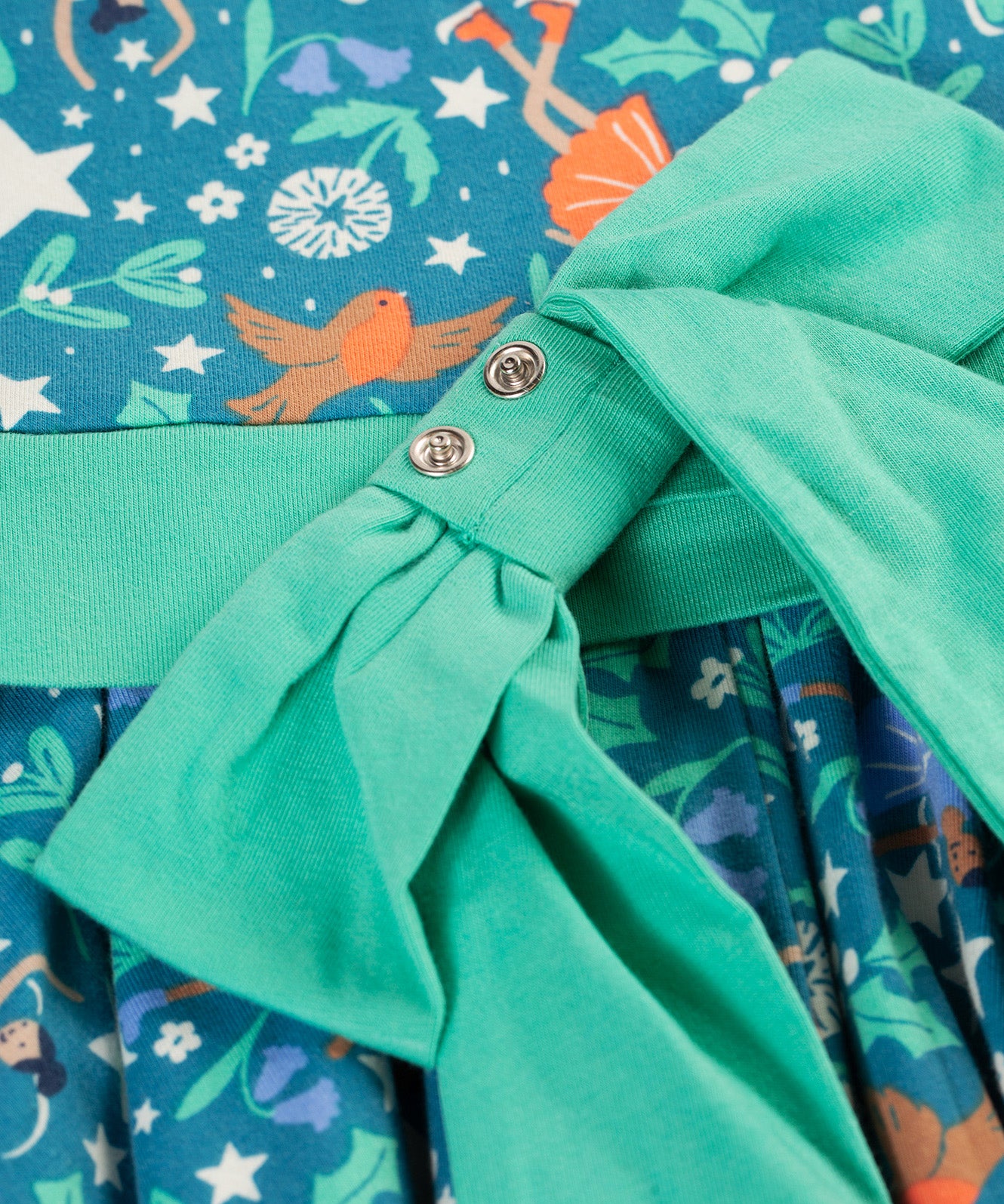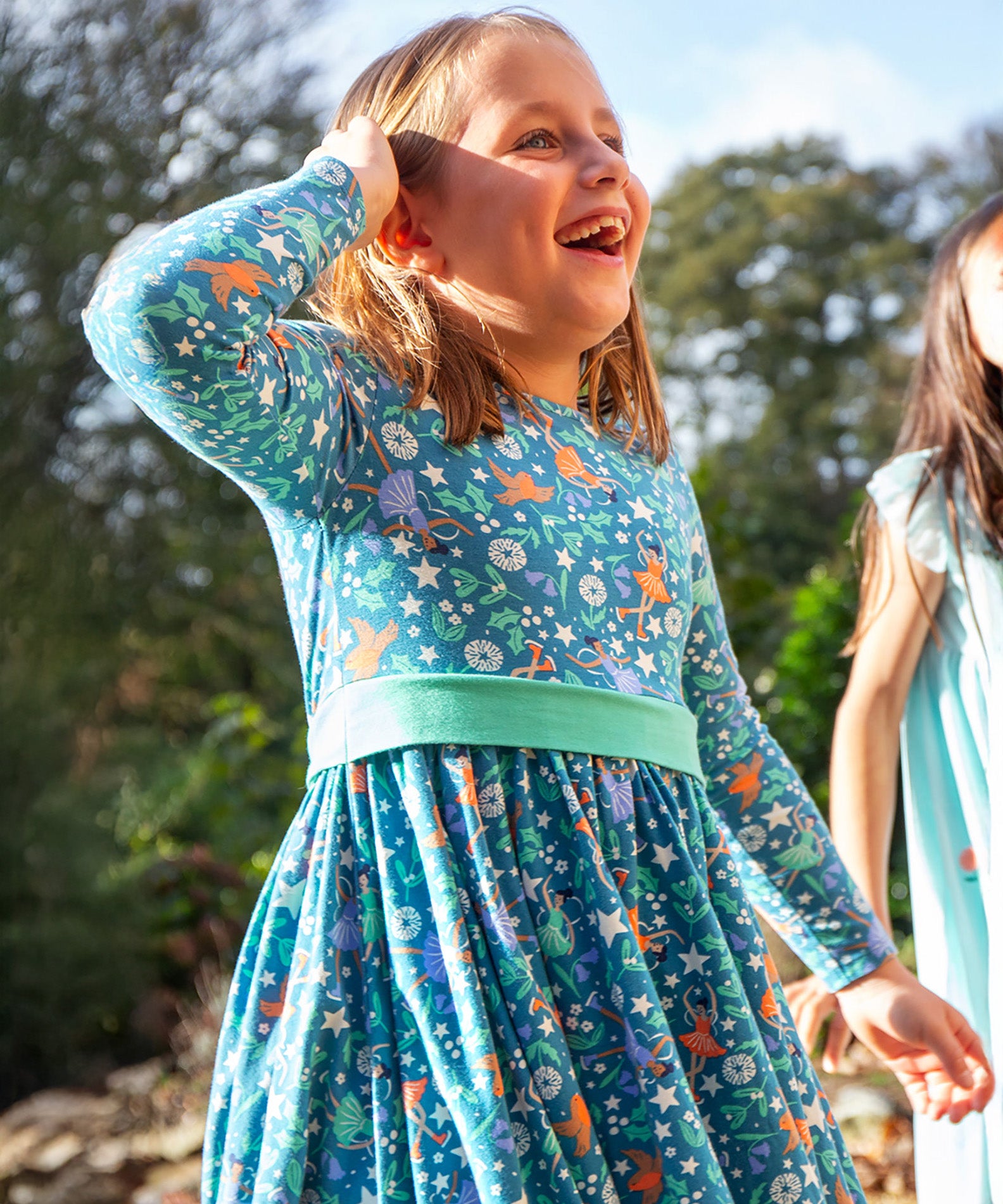 This organic cotton dress from Frugi is perfect for parties! With plenty of twirl, colour, and a big teal bow at the back, this children's party dress will have your little one feeling like a princess. In a pretty blue with an Enchanted Forest print, this long-sleeved dress features little robins, flowers, stars, and ballerina fairies, giving it a festive vibe and making it a brilliant choice for Christmas parties.