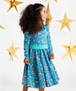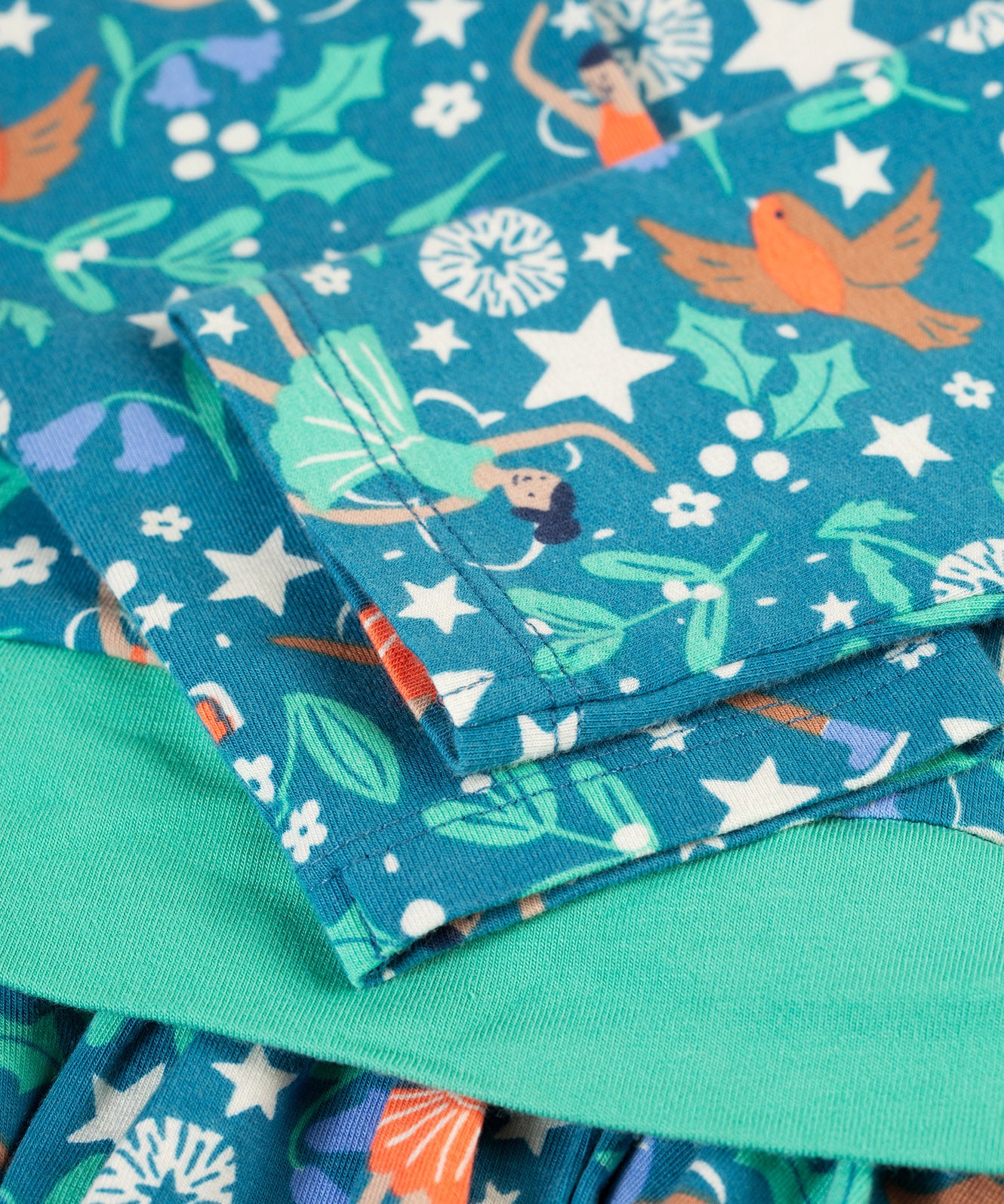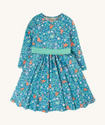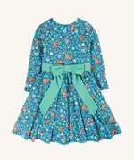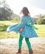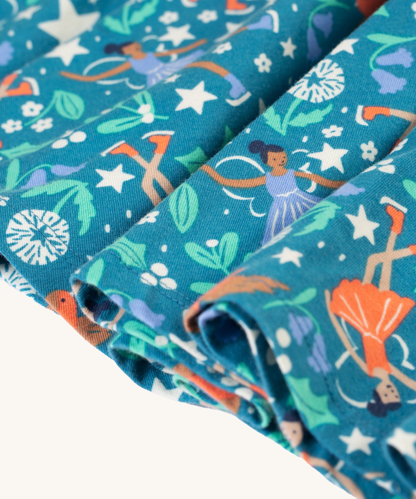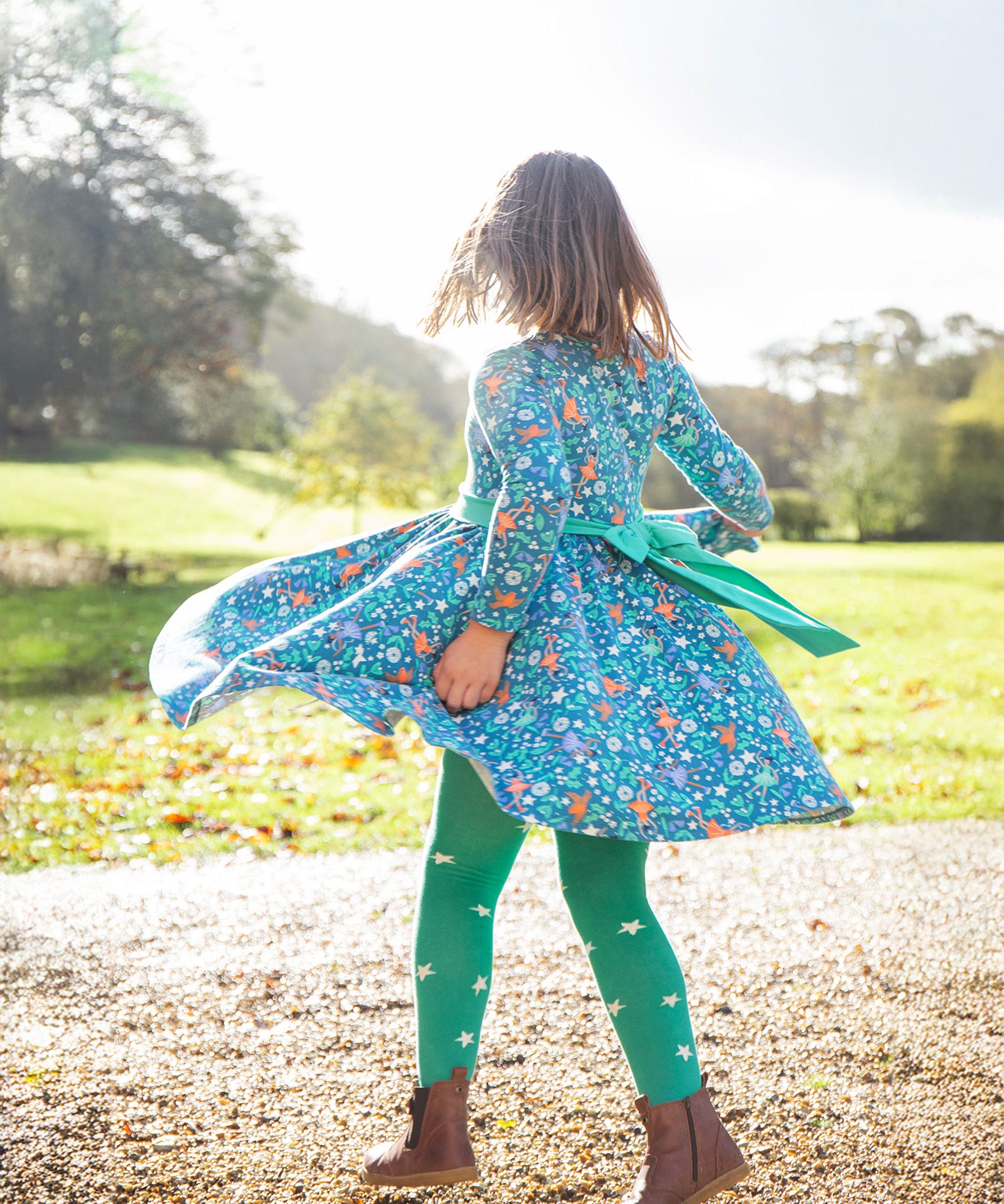 This organic cotton dress from Frugi is perfect for parties! With plenty of twirl, colour, and a big teal bow at the back, this children's party dress will have your little one feeling like a princess. In a pretty blue with an Enchanted Forest print, this long-sleeved dress features little robins, flowers, stars, and ballerina fairies, giving it a festive vibe and making it a brilliant choice for Christmas parties.