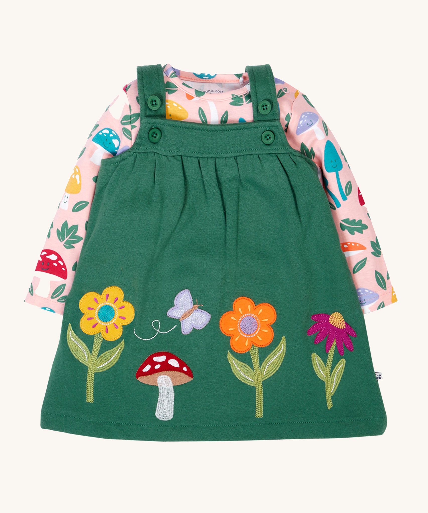 Frugi kids pippa holly green fun guys pinafore outfit available at Babipur. a 100% GOTs organic cotton outfit. Features a pink long sleeve top with cute woodland inspired prints and a green pinafore with flowers, mushroom and a bee applique