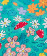 A super close up of the print on the Frugi Sofia skater dress with a wild woods print design on a green background. The print features flowers, toadstools and leaves.