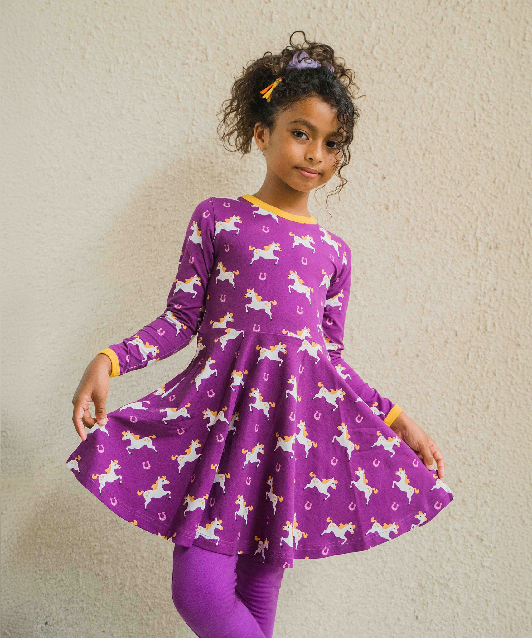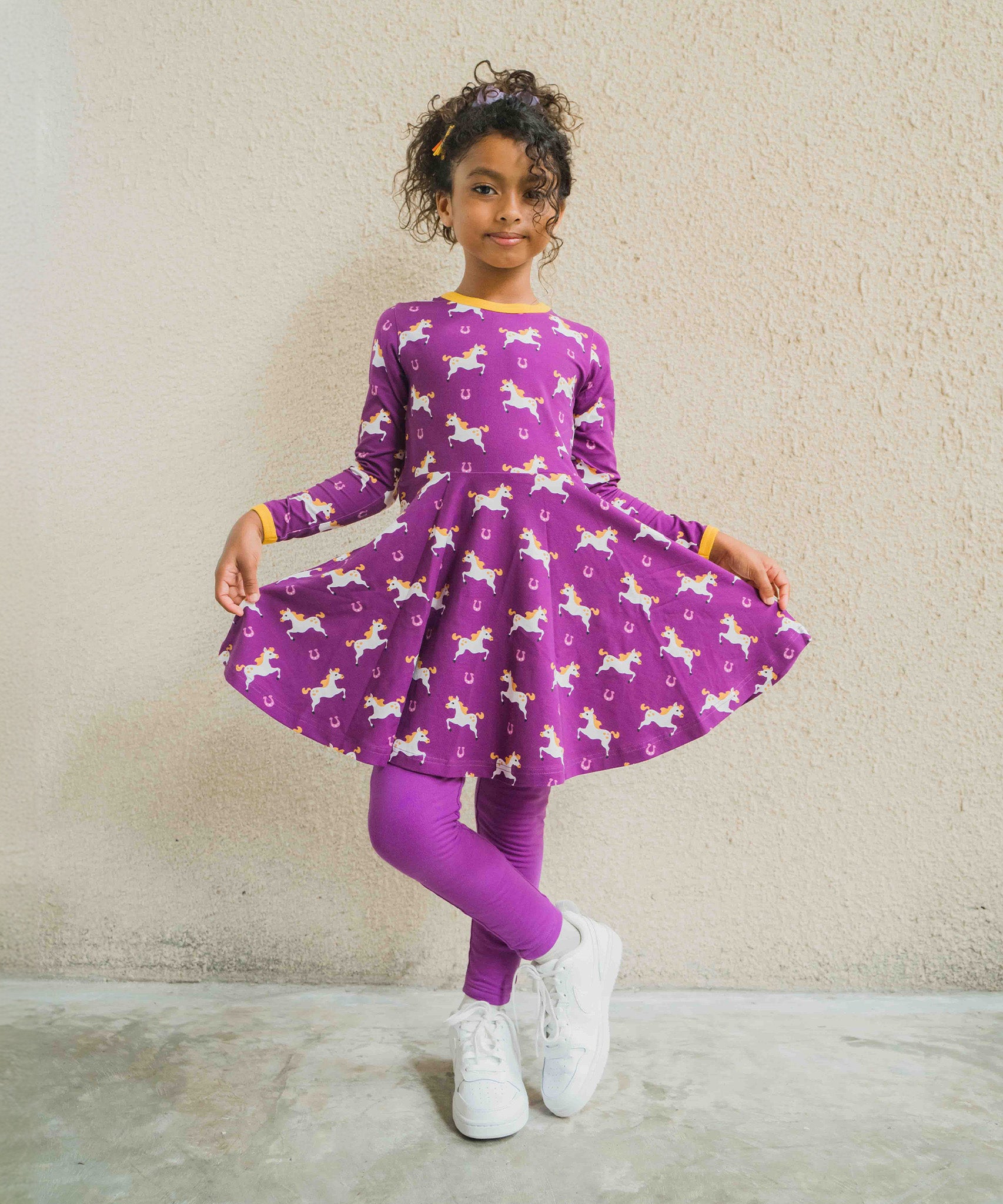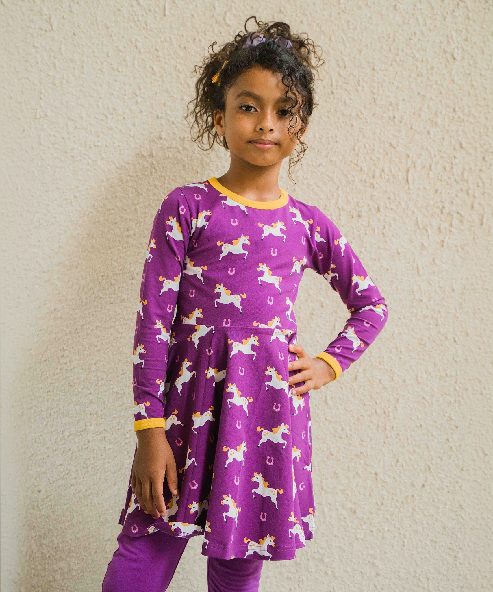 This bright, organic skater-style kid's dress has a fun galloping horse repeat pattern on purple with contrasting yellow trim. Great for layering on colder days with leggings and a hoodie or wearing on its own on mild days.