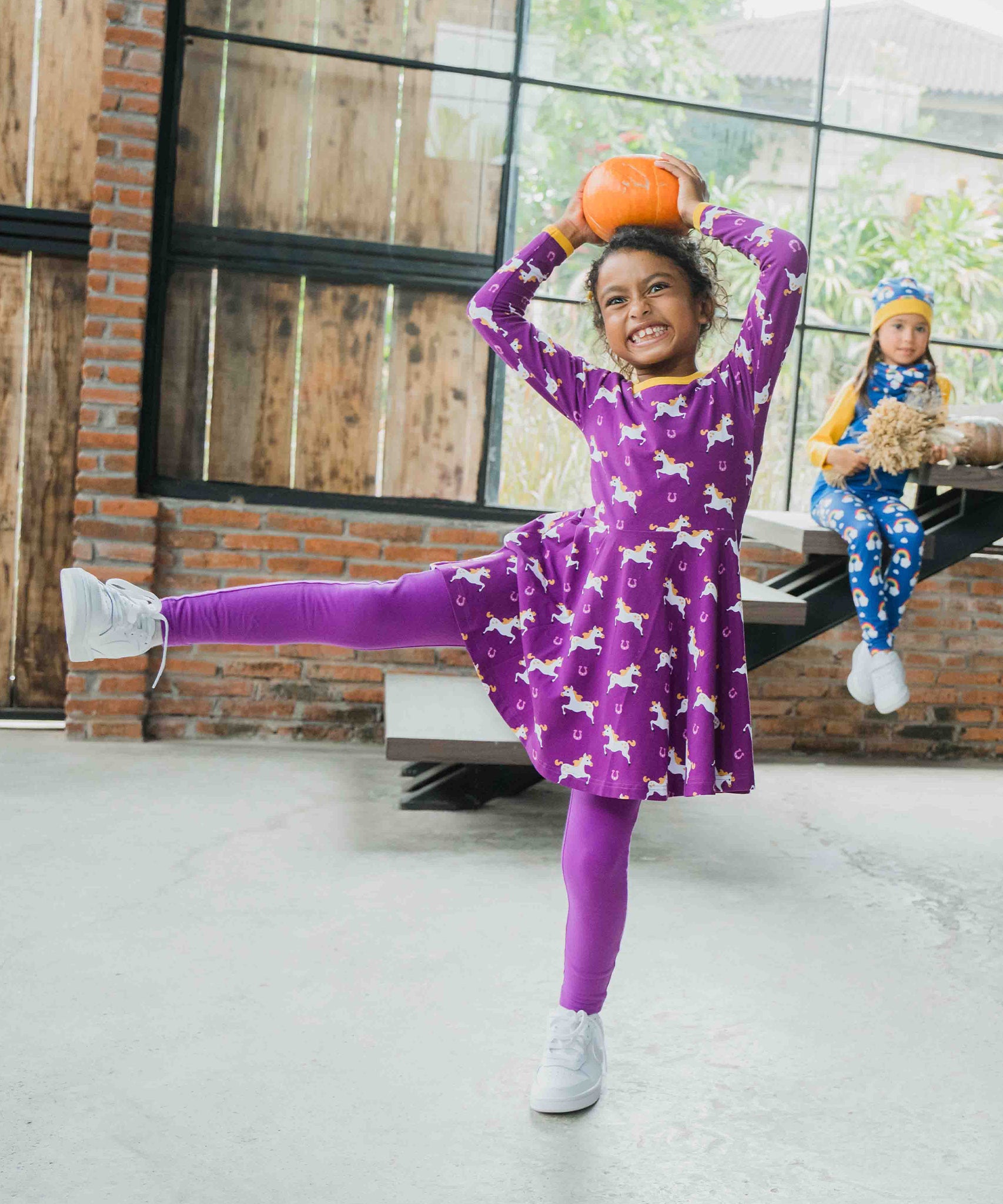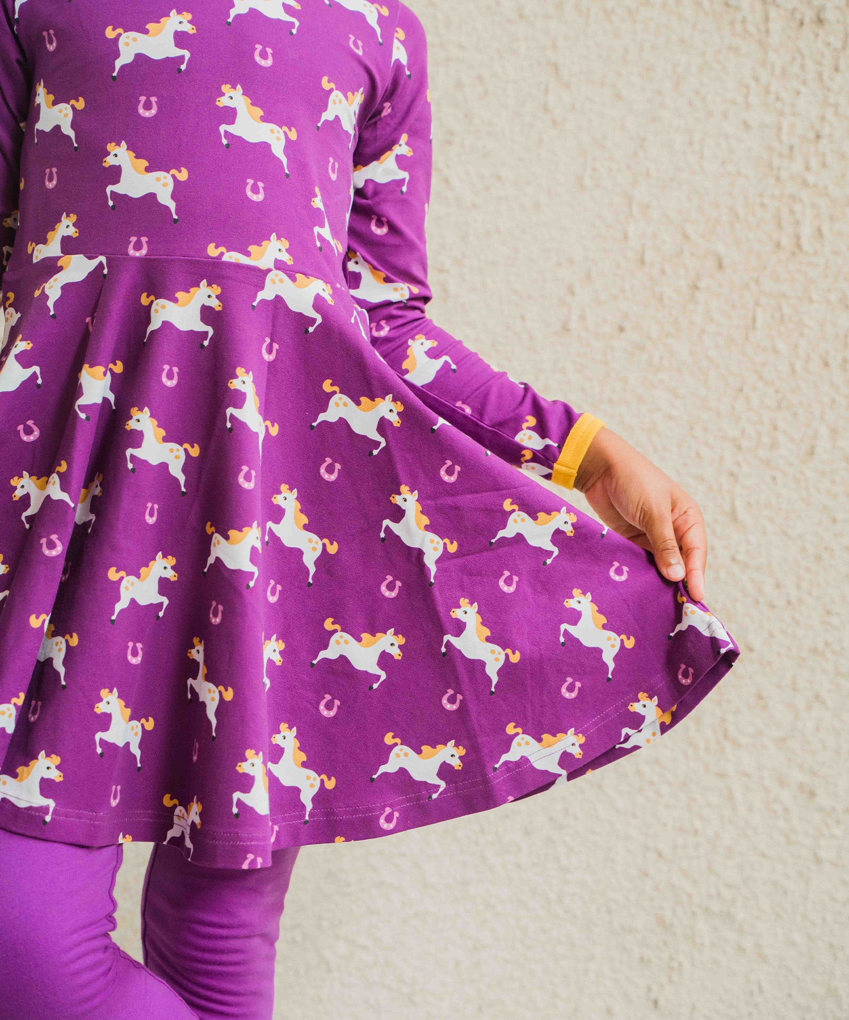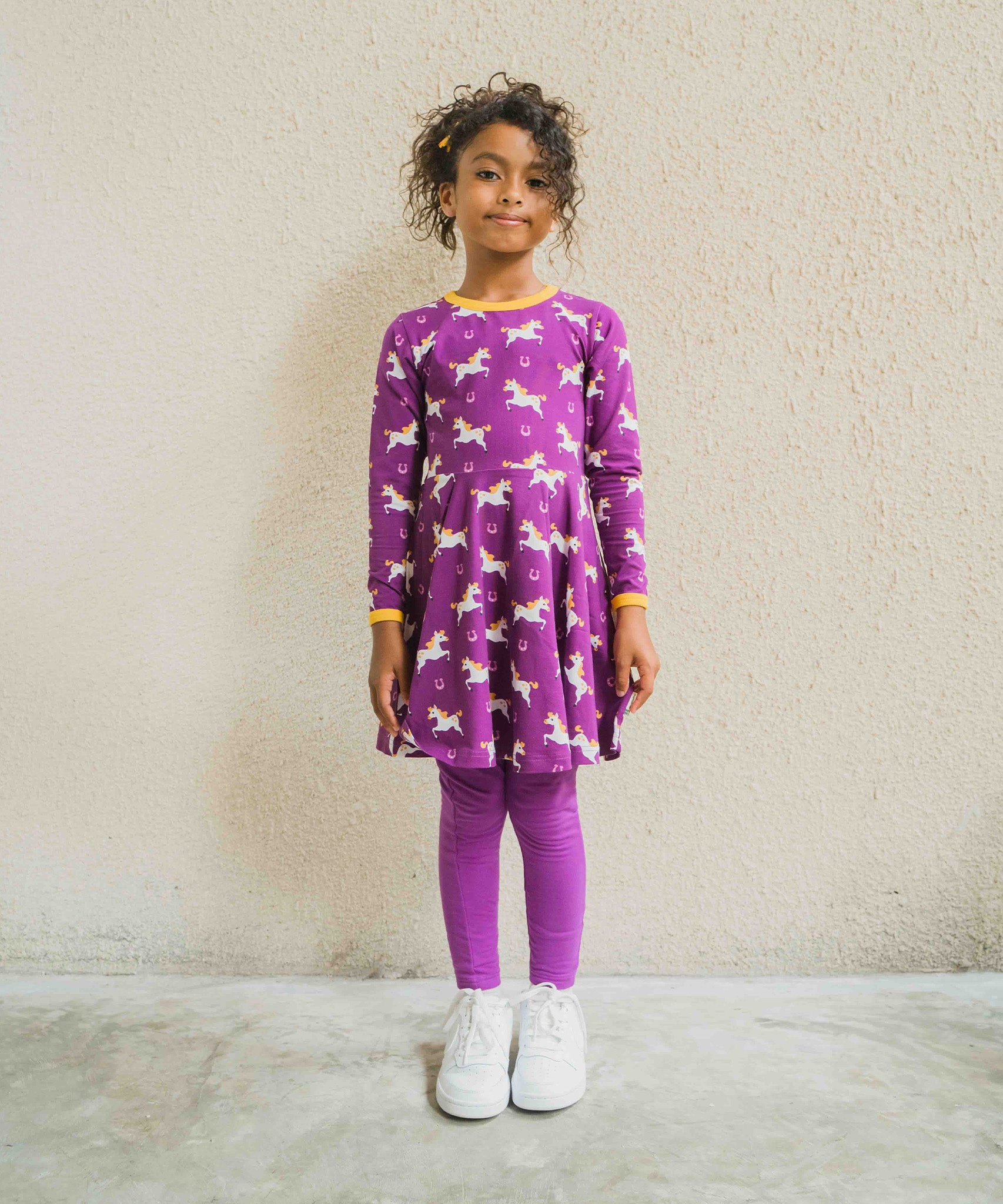 This bright, organic skater-style kid's dress has a fun galloping horse repeat pattern on purple with contrasting yellow trim. Great for layering on colder days with leggings and a hoodie or wearing on its own on mild days.