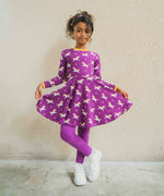 Maxomorra Organic Cotton Horse Long Sleeve Circle Dress in purple fabric with cream horse print and yellow piping