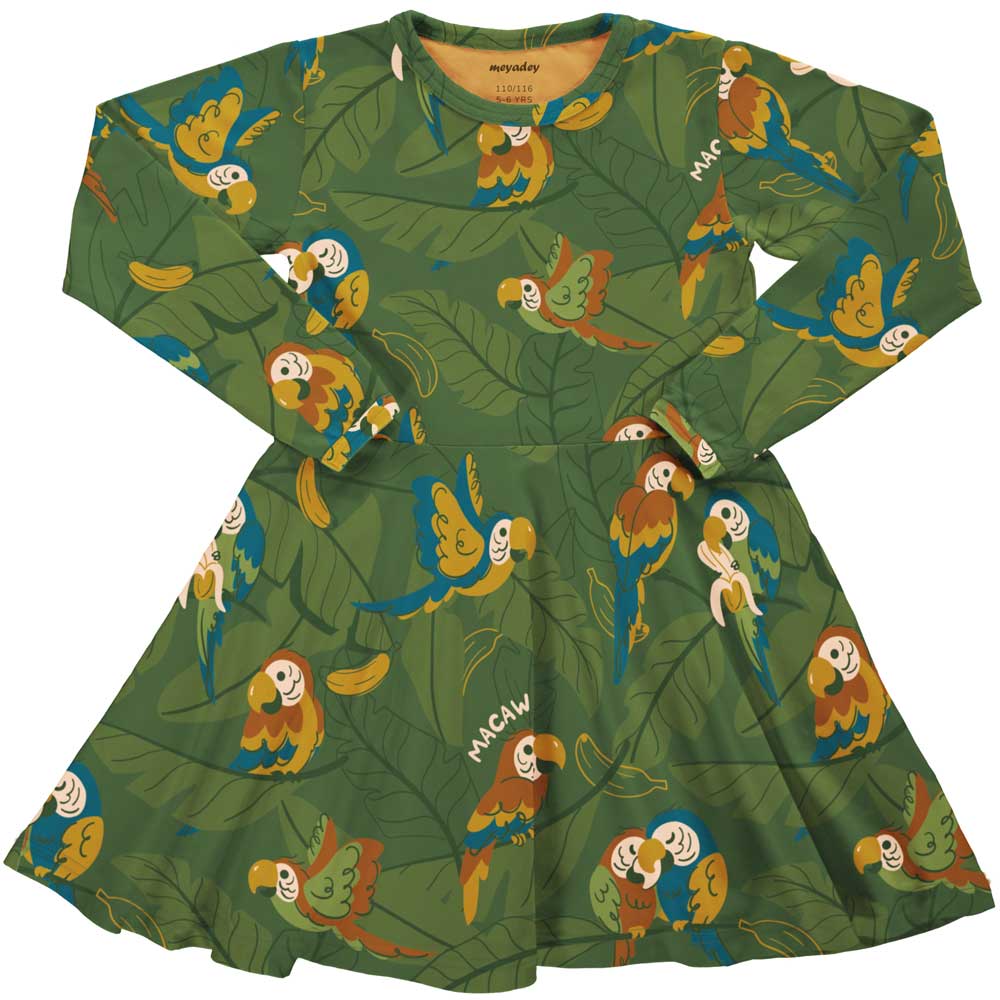 Meyadey Marvellous Macaw, organic, skater style dress in rich green with macaw and leaves repeat print.