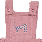 Pigeon Organics pinafore- GOTS organic cotton pinafore sleeves dress in pink corduroy. Features 2 small pockets at the front, button fasteners on the shoulders, an elasticated waist band and a pink cat embroidery on the chest.