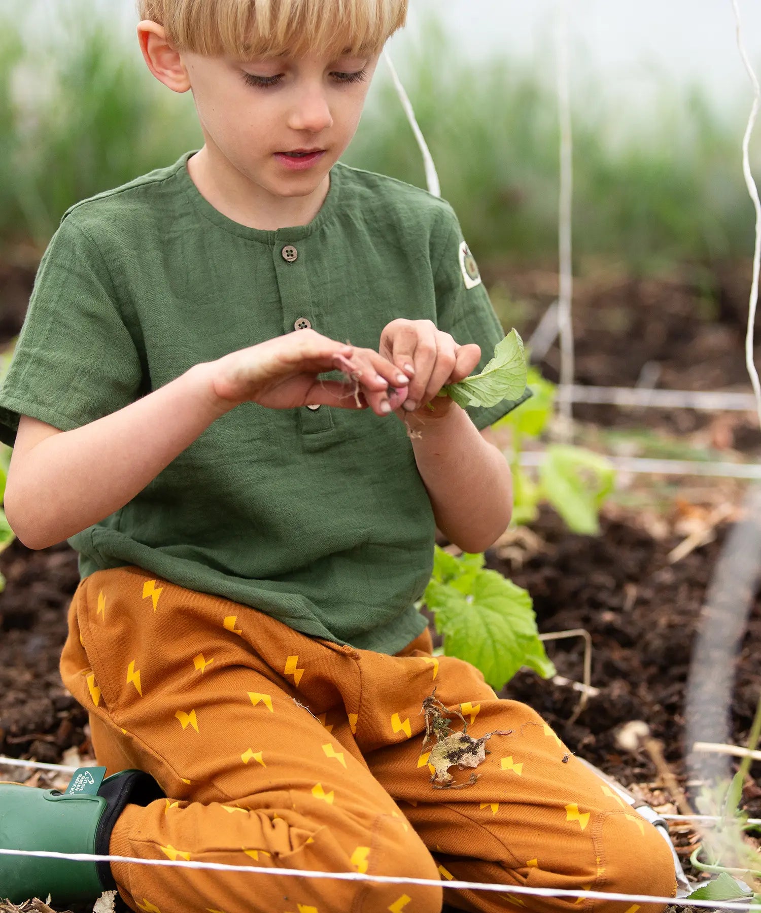 Close up of child kneeling down wearing the Little Green Radicals yellow gold repeat lightning print cosy organic cotton kids joggers with a green henley muslin t-shirt.