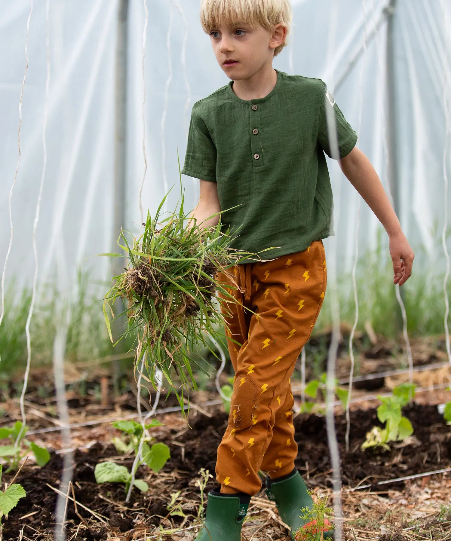 Child kneeling down wearing the Little Green Radicals yellow gold repeat lightning print cosy organic cotton kids joggers with a green henley muslin t-shirt.