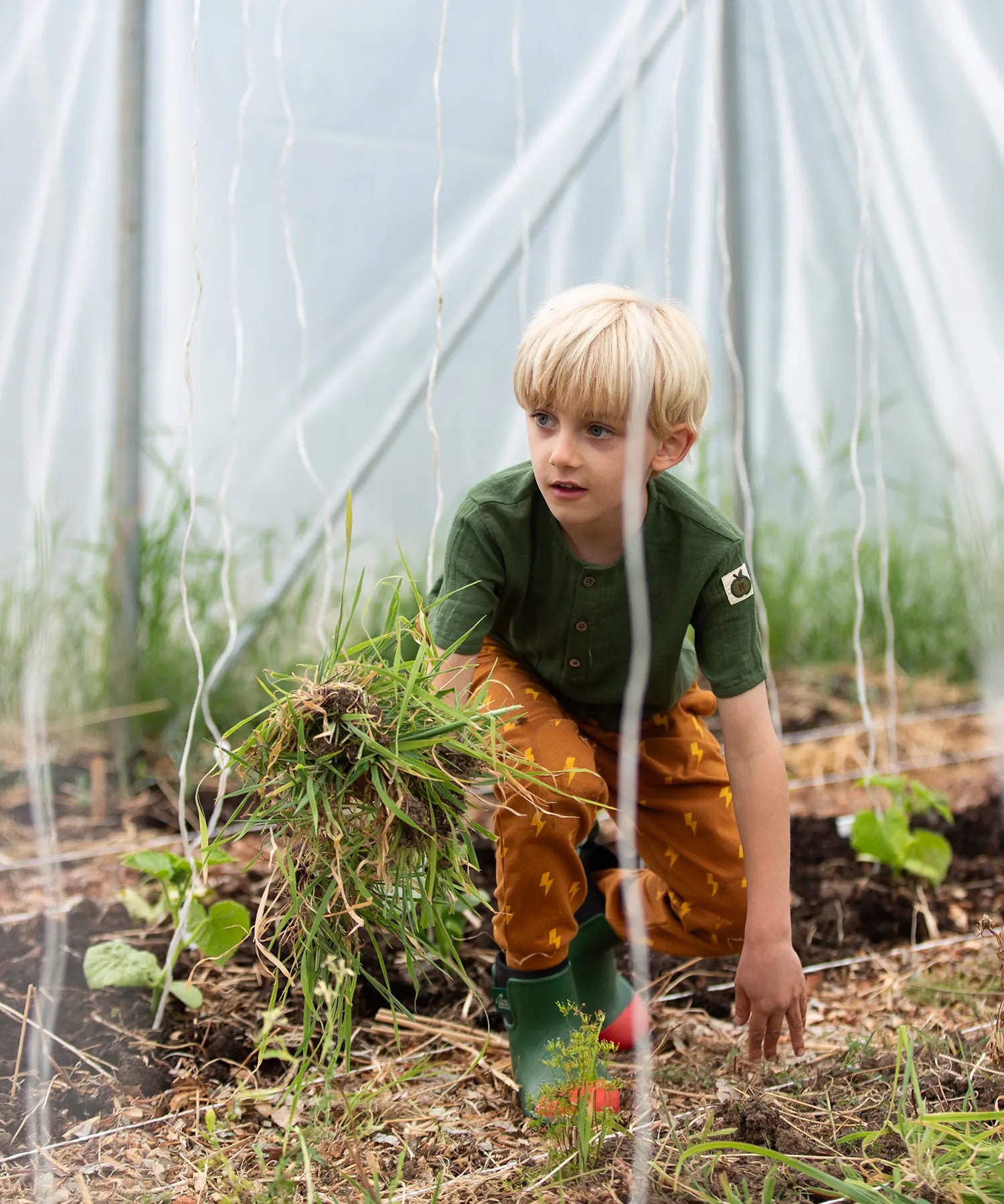 Child kneeling down wearing the Little Green Radicals yellow gold repeat lightning print cosy organic cotton kids joggers with a green henley muslin t-shirt and green and red wellington boots.