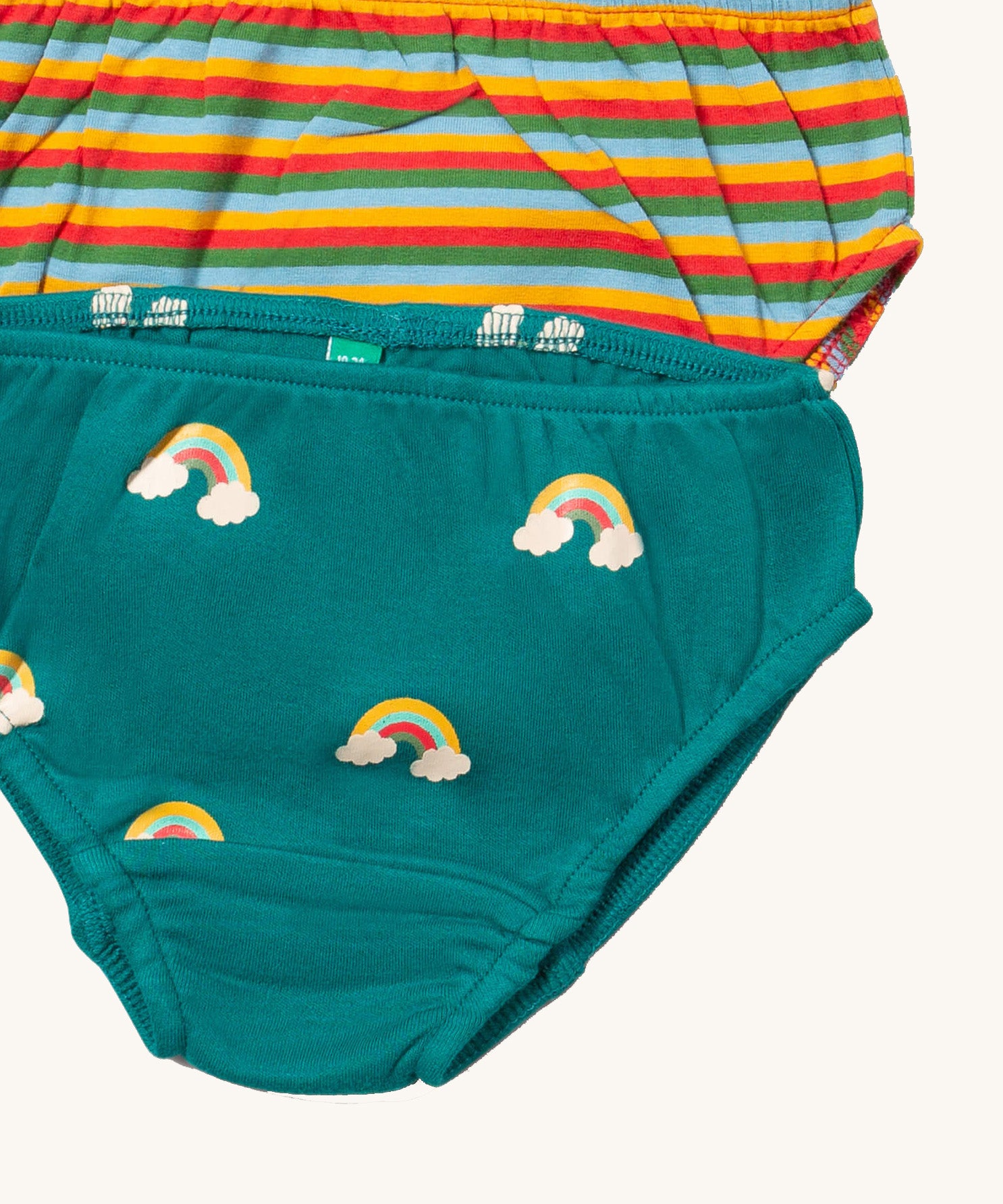 Little Green Radicals turquoise rainbows underwear available at Babipur. A GOTS organic cotton underwear multipack, features red, a autumn inspired striped and turquoise coloured underwear with little prints of rainbows on clouds.