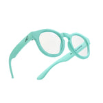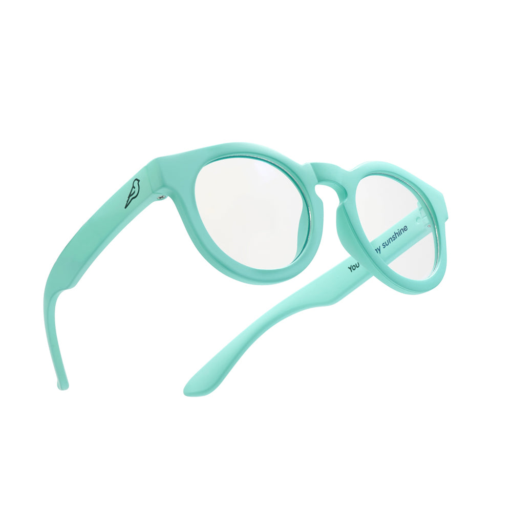 The Birds Eyewear Kid’s Birdies Screen Glasses in Sky Blue are a funky pair of plant-based kids screen glasses in light blue, with blue light blocking round lenses and a small Bird logo on the arm.