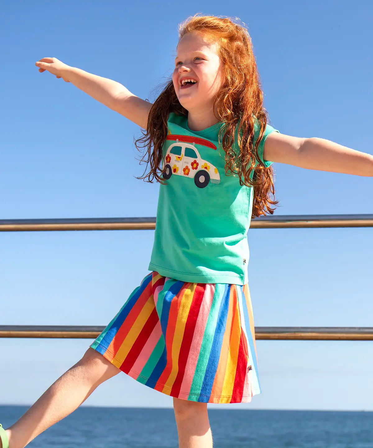 Child wearing Frugi Alba skort in rainbow stripes with the ocean in the background