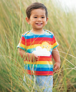 Here we have a super soft Bobster applique rainbow t-shirt by Frugi. The rainbow coloured 100% GOTS organic cotton fabric has a sweet smiling sun applique on the chest with bright jewel green trim around the borders of the garment. The t-shirt has a special envelope flap neckline, so you can easily open it and slip the t-shirt down your child's body than over their head! Ethically made from 100% GOTS certified organic cotton interlock, this Frugi t-shirt is super soft on delicate skin and are eczema-friendly, and eco-friendly. These are ideal for wearing under Frugi's perfect pocket pinafore dress, or with Frugi's Little knitted Leggings or under dungarees for the ultimate eco-outfits!