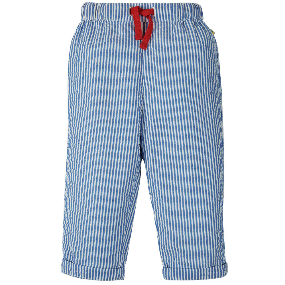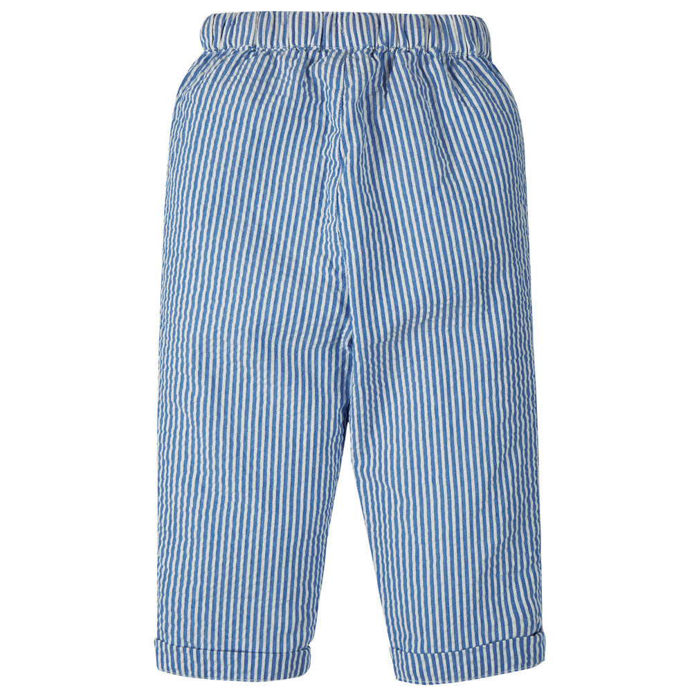 These Frugi Cobalt Blue Stripe Marnie Pull Ups are blue and white striped, organic cotton seersucker trousers for babies and toddlers with a soft crinkled texture. Lightweight for warm summer days and with an elasticated waist and red draw string for a perfect fit. Wear year-round with a comfy bodysuit or top for a Frugi outfit that is kind on delicate skin, eczema-friendly and sustainable too. Frugi trousers are adorable on tots and a hit with eco-friendly parents.