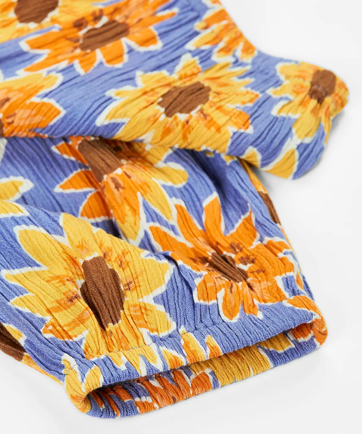 Frugi Lowenna jumpsuit in purple with a repeating sunflower print. Showing frilled shoulder and elasticated leg cuffs