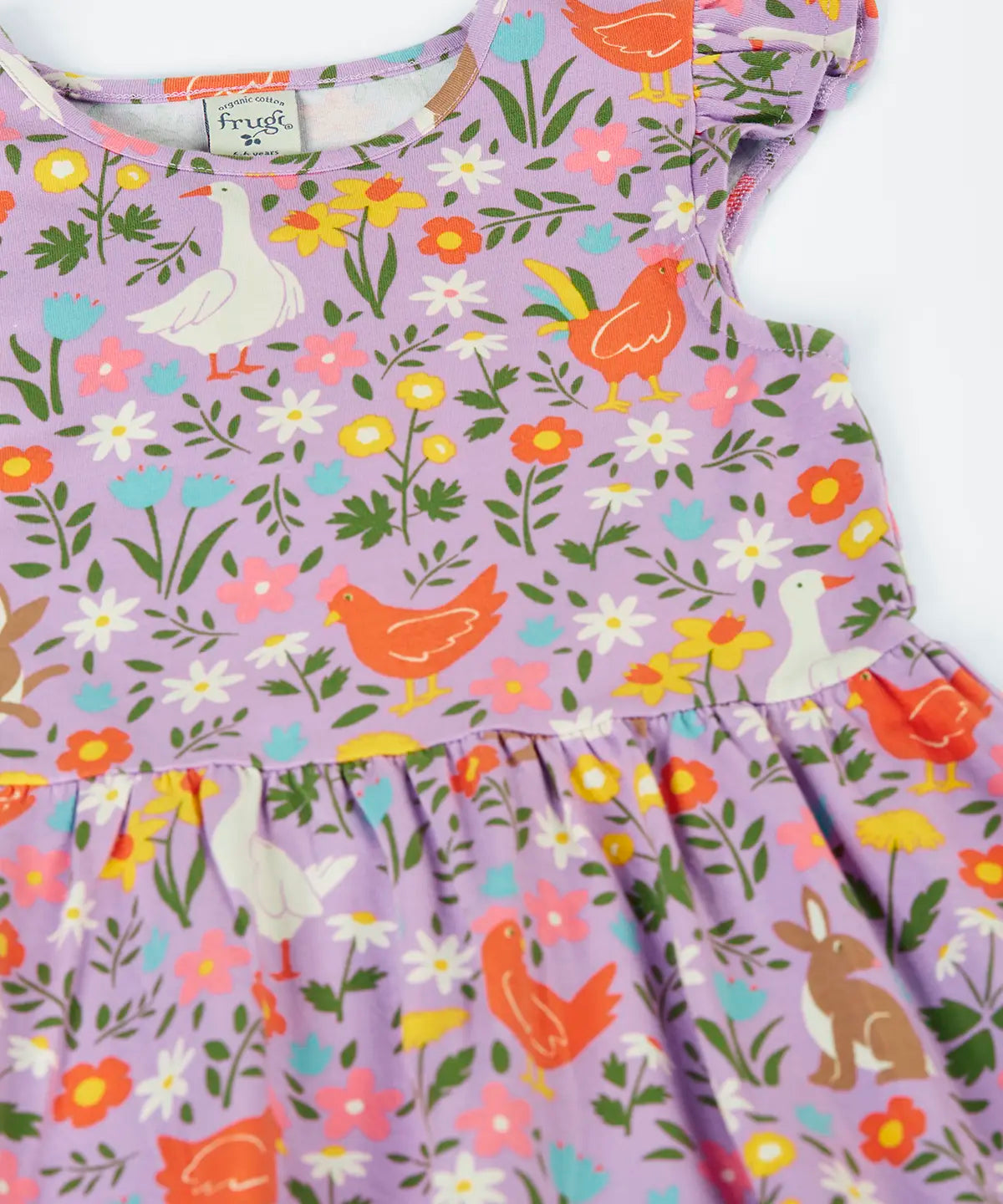 The Frugi Olivia Skater Dress is an organic cotton children’s dress made from soft and breathable GOTS certified organic cotton. Designed in a skater style with a tiered skirt and frill sleeves, this violet dress features hens, geese and rabbits playing through a colourful flower meadow.