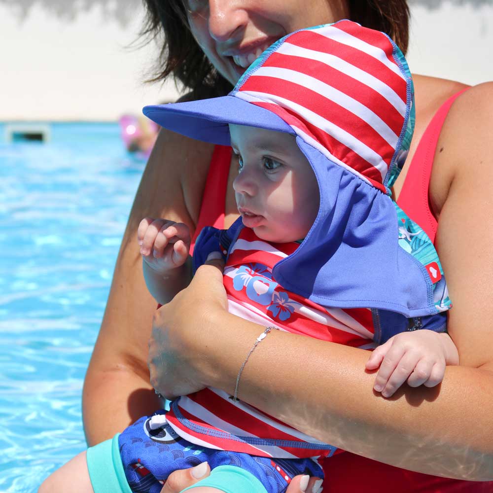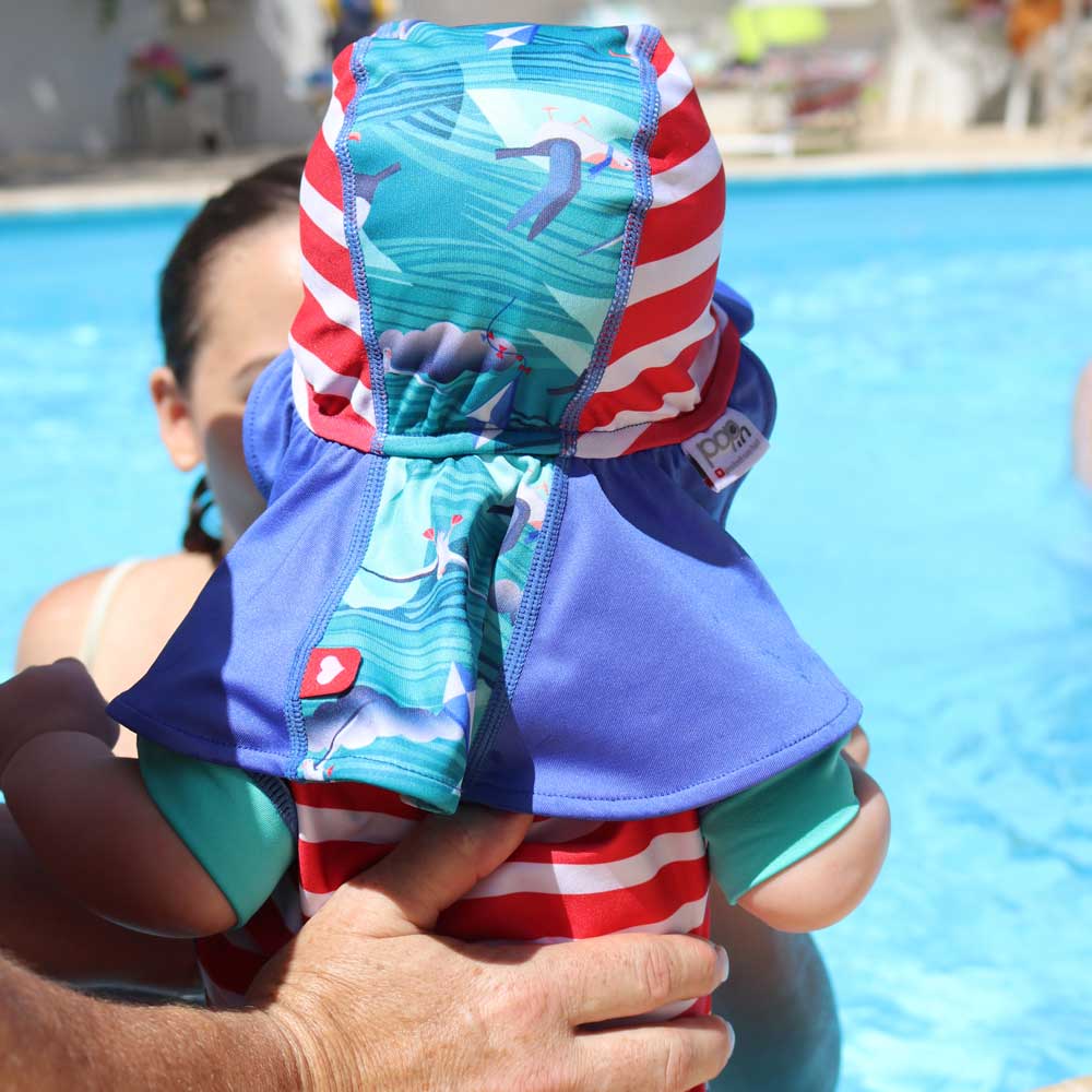 This sun hat has an elasticated band to keep it in place and is made from stain-resistant fabric - handy when your tot is covered in sun cream and ice cream! This children's swim hat is a perfect match for a whole load of baby and children's products from Pop-In. Team up with a matching swim nappy and accessories for a fun look on the beach this summer. Rinse immediately after use and wash with coloured clothing or nappies.