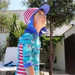 This Close Pop-In Albatross Sun Hat is made with UPF 50+ fabric and has a back flap for added coverage your child's neck and ears in the sun. This sun hat has blue sides and an aqua strip down the middle with a fun short-legged albatross pattern.