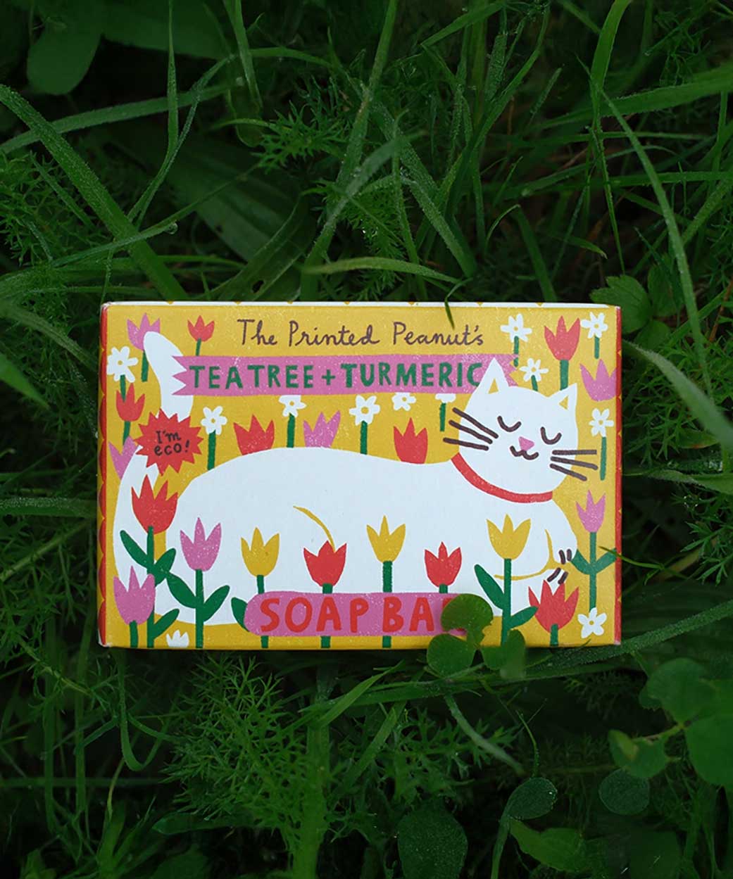 The Printed Peanut tea tree & turmeric natural handmade soap bar yellow decorative box showing a white cat lying down on flowers