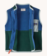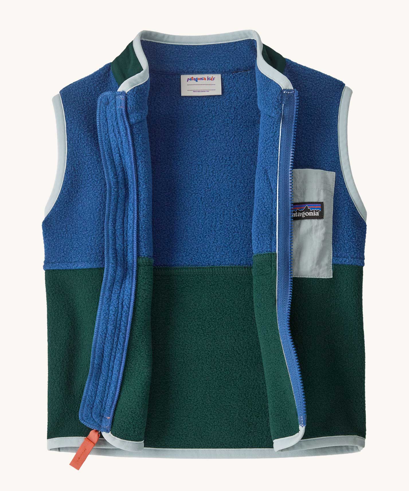 Patagonia little kids synchilla vest in clement blue available at Babipur. A 100% recycled polyester soft fleece gilet in dark blue and green with pale blue trim. Features a full length zip and a pale blue chest pocket