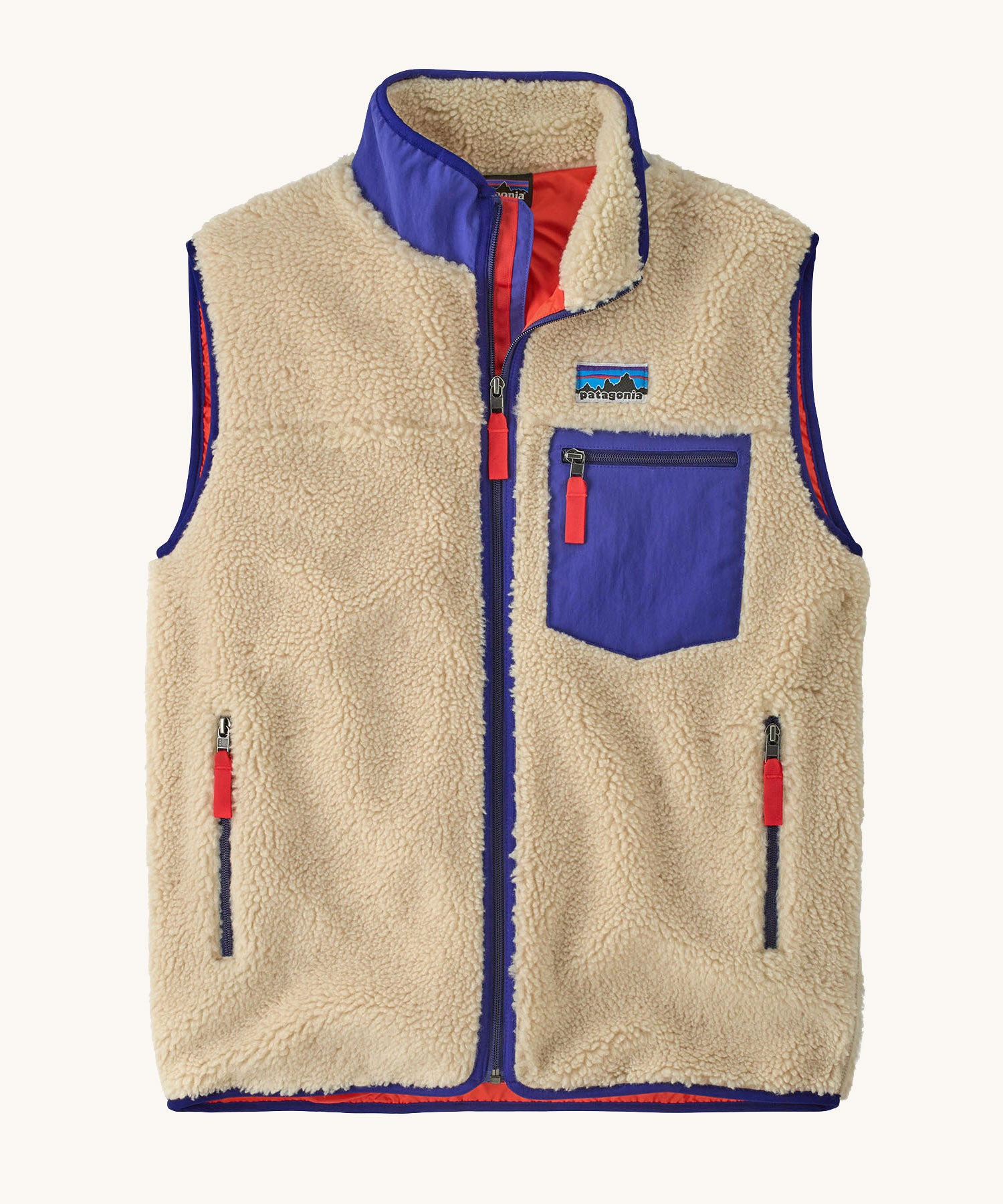 The ¼-pile fleece is soft and insulating while also blocking wind, thanks to a fully lined construction. Inside, a recycled polyester taffeta lining with a durable water repellent finish made without added PFAS helps stop cold gusts cutting through, keeping warmth close to the body. Finished in Dark Natural, the fleece comes in a natural cream shade, contrasted with dark blue elastic binding and orange zip pulls and lining, giving the vest a distinctive retro look rooted in Patagonia’s heritage.