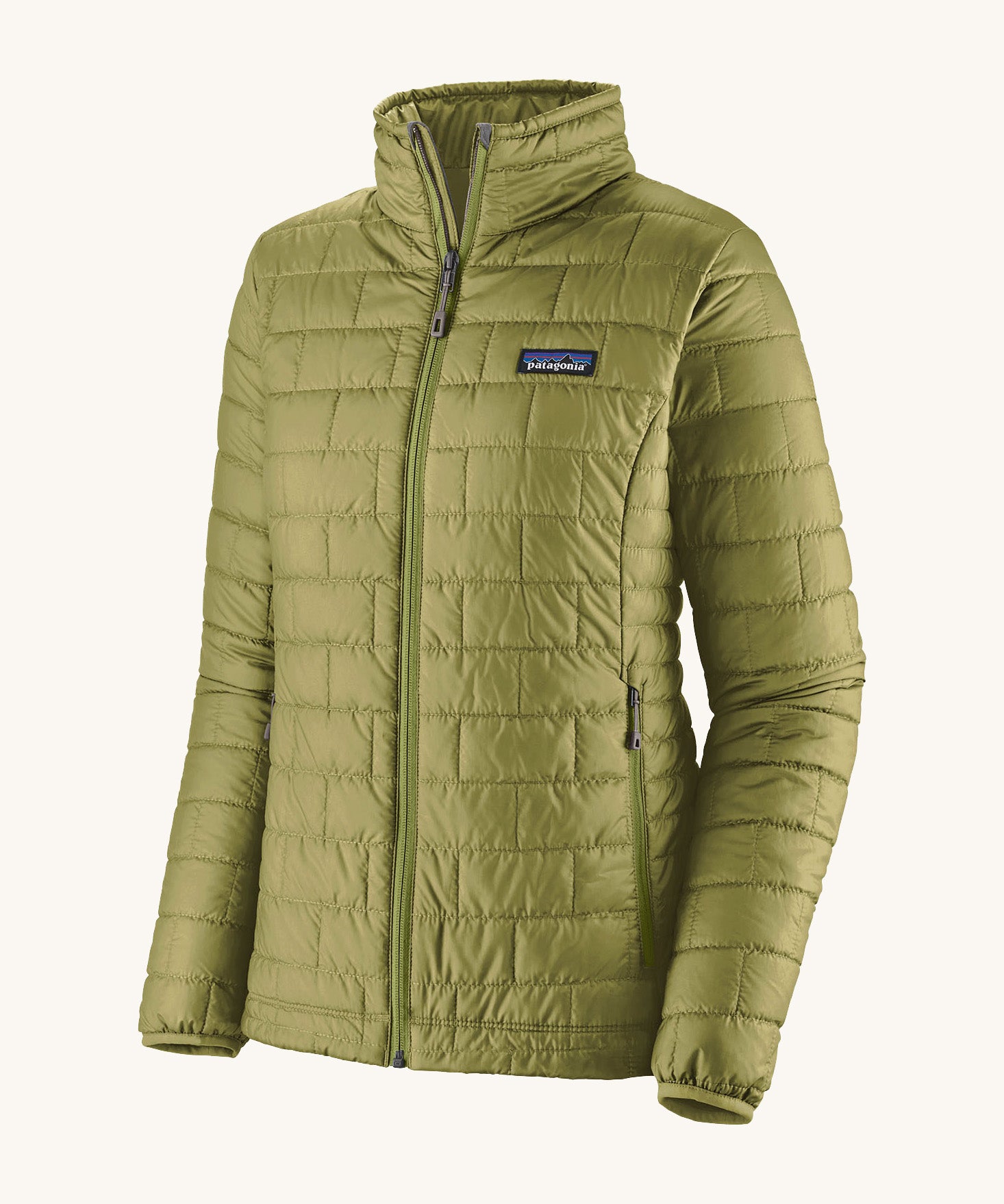 A female model wearing the Patagonia womens nano puff jacket in graze green showing the front fit of the jacket