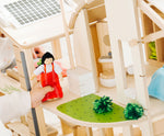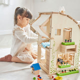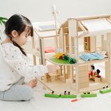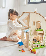 A child standing besides the PlanToys Green Dolls' House and Furniture Set. This eco inspired house has a lot of earth friendly features like a pretend recycling point, wind turbine, solar panel and grass and plants.