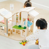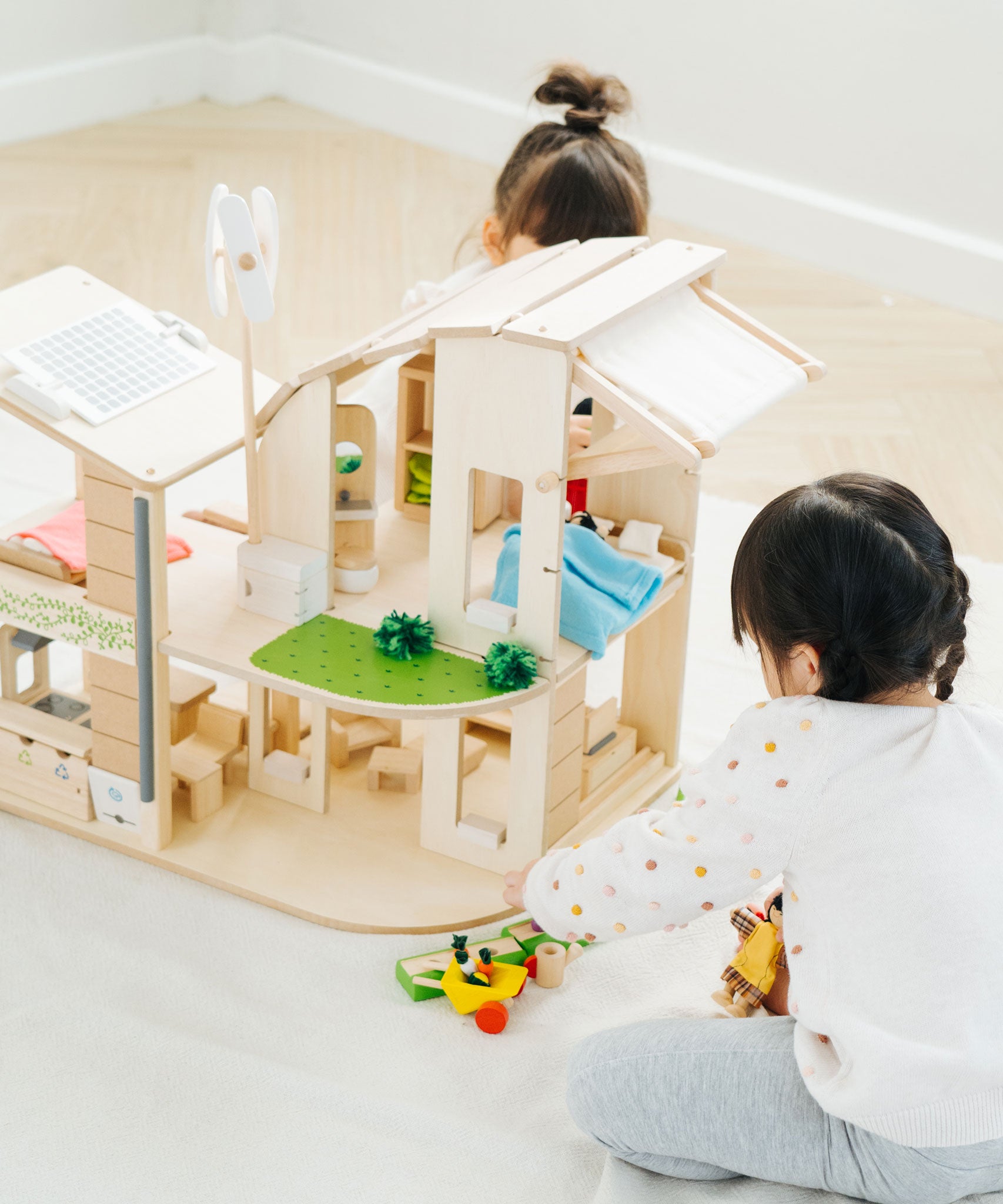Two children playing with the PlanToys Green Dolls' House and Furniture Set. The house is placed on a white coloured rug and the children are sitting on opposite sides of the house.