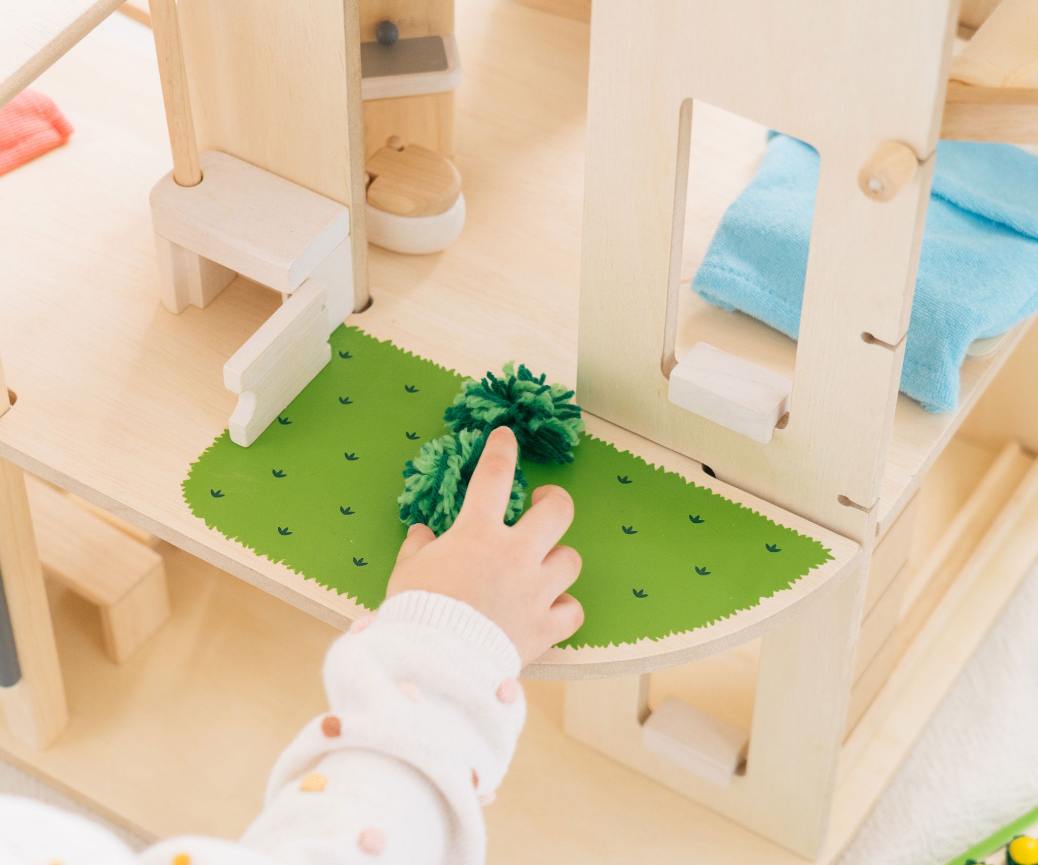 A close up of the grass effect painted areas on the side of the PlanToys Green Dolls' House and Furniture Set. A child's hand can be seen reaching for a green grass like pom pom.