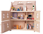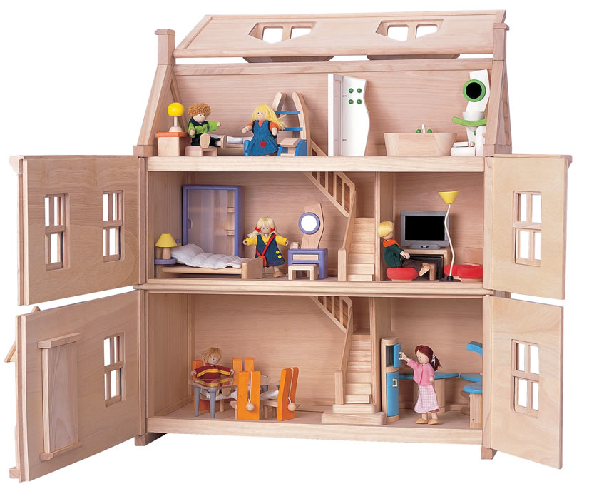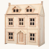 The PlanToys wooden Victorian Dolls House on a plain background.