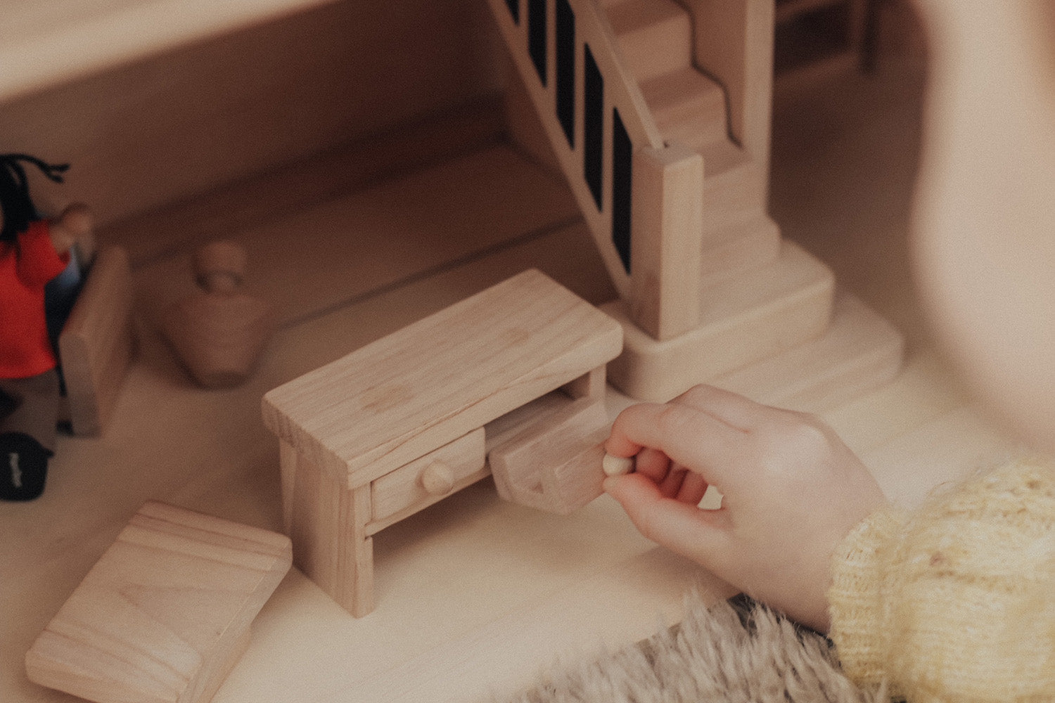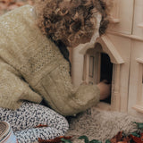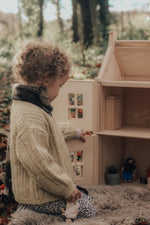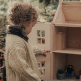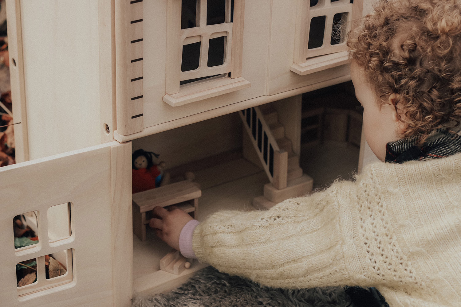 A close up of a child playing with the PlanToys Victorian Dolls House in a forest.