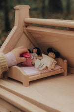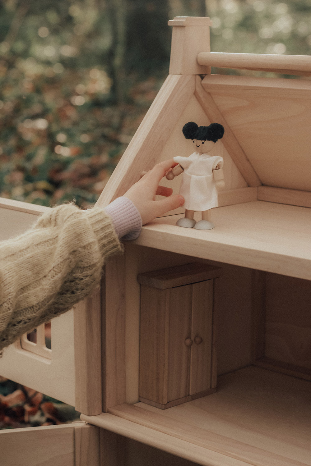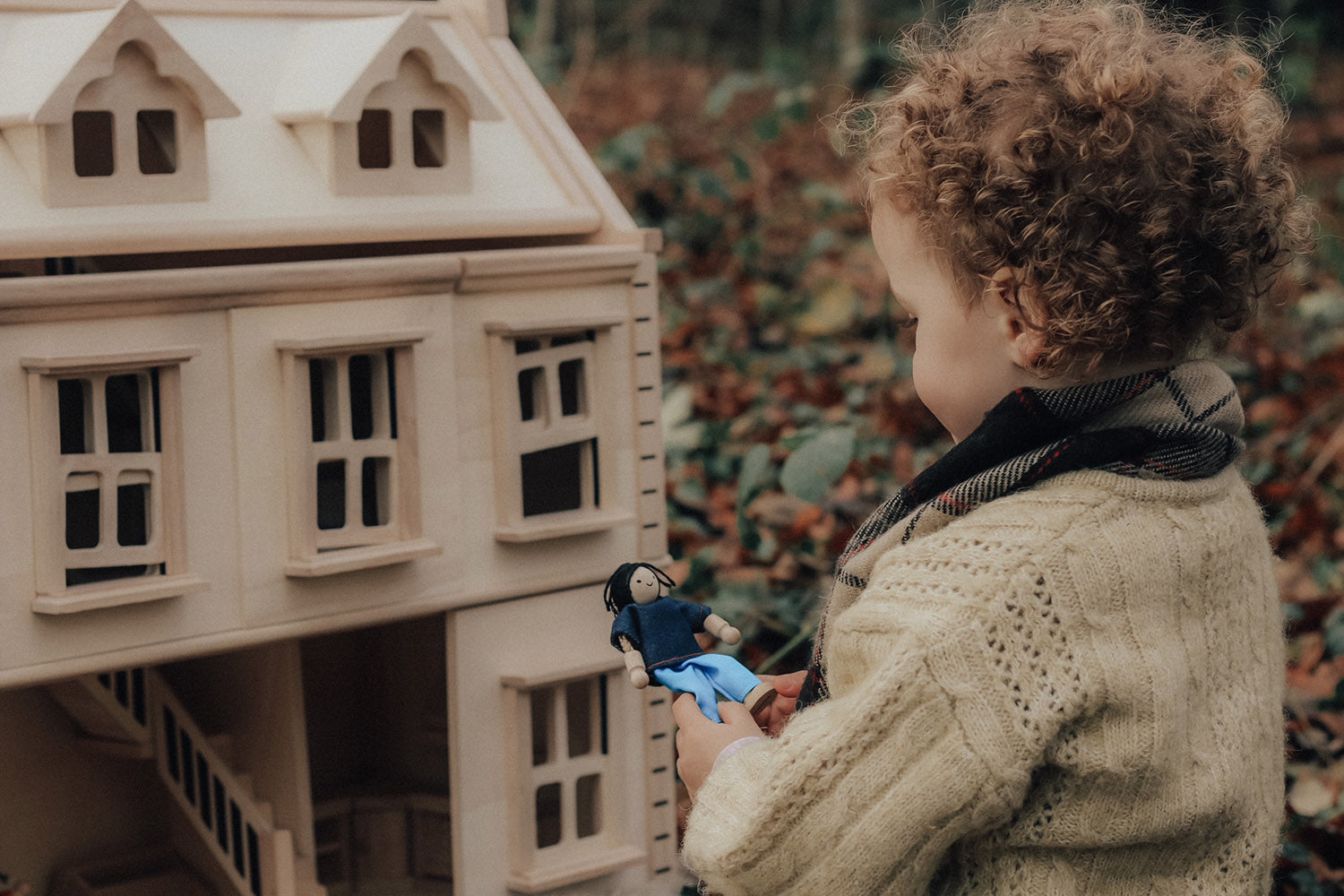 A child playing with the PlanToys Victorian Dolls House in a forest. They are holing onto a wooden dolly.
