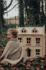 A child playing with the PlanToys Victorian Dolls House in a forest.