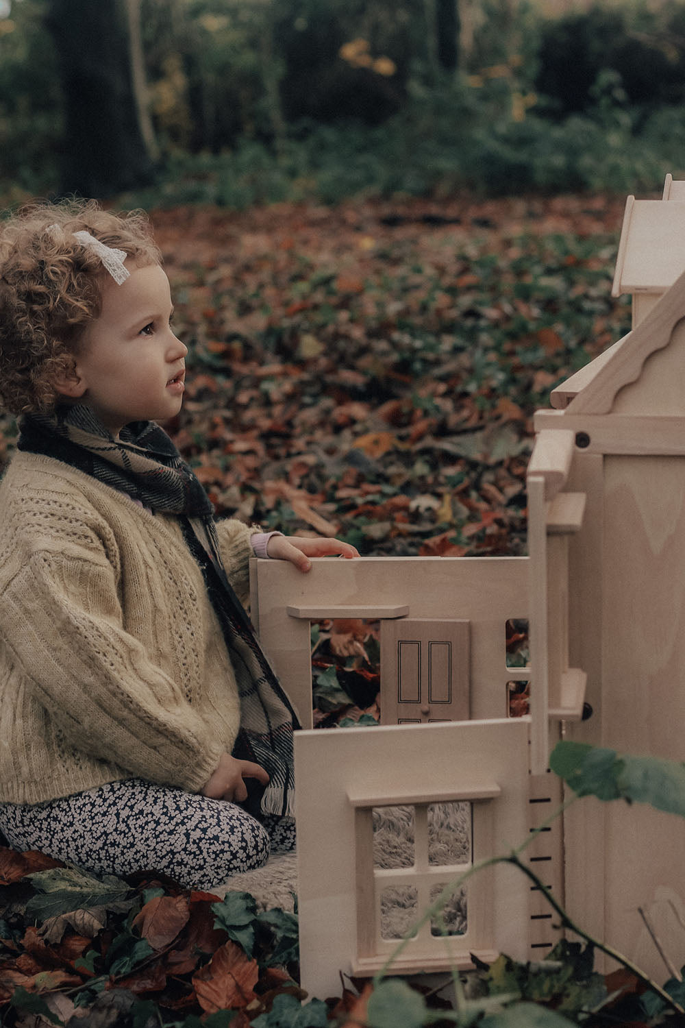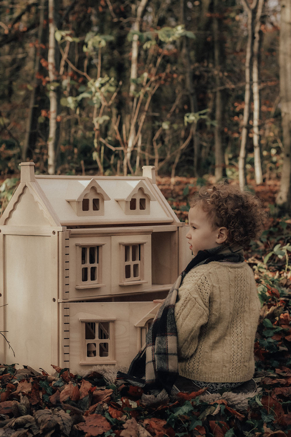 A child sitting on a leaf covered floor in the forest playing with a PlanToys Victorian Dolls House.