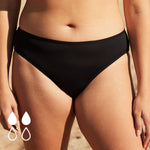 Feel comfortable and confident whether you're swimming in the sea, sunbathing at the pool or doing vigorous laps in water sports - these Black Swim Bikini Briefs by Wuka are fantastic protection during menstruation for the lighter flow of your period. Made from stretchy 100% recycled nylon, these are super soft and comfortable, reusable menstrual swim briefs with a wide stretchy waistband. The outer fabric of these bikini briefs are treated with water repellent to ensure the highest comfort and security, and the high leg cut sits comfortably on skin. These briefs are thin enough to either be worn alone or worn underneath another pair of bikini bottoms or a swimming costume. With the absorbent power to hold 10ml worth of period flow (2 tampons worth), the recommended wear-time on these is a maximum of 8 hours - but personal caution is advised to suit your individual flow.