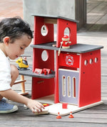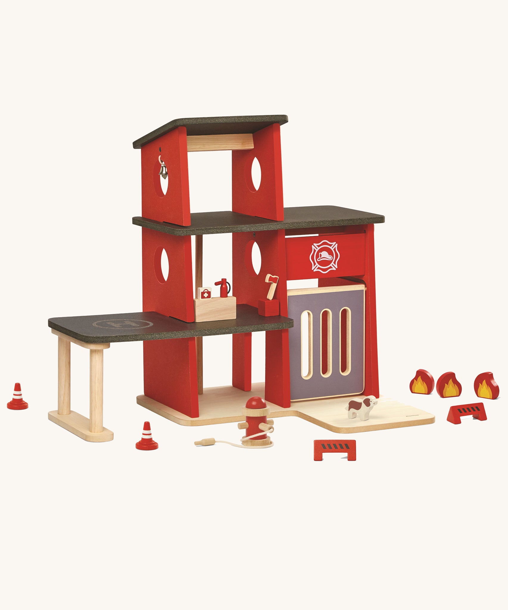 The PlanToys Fire Station with little wooden figures around the bottom of the fire station, on a cream background