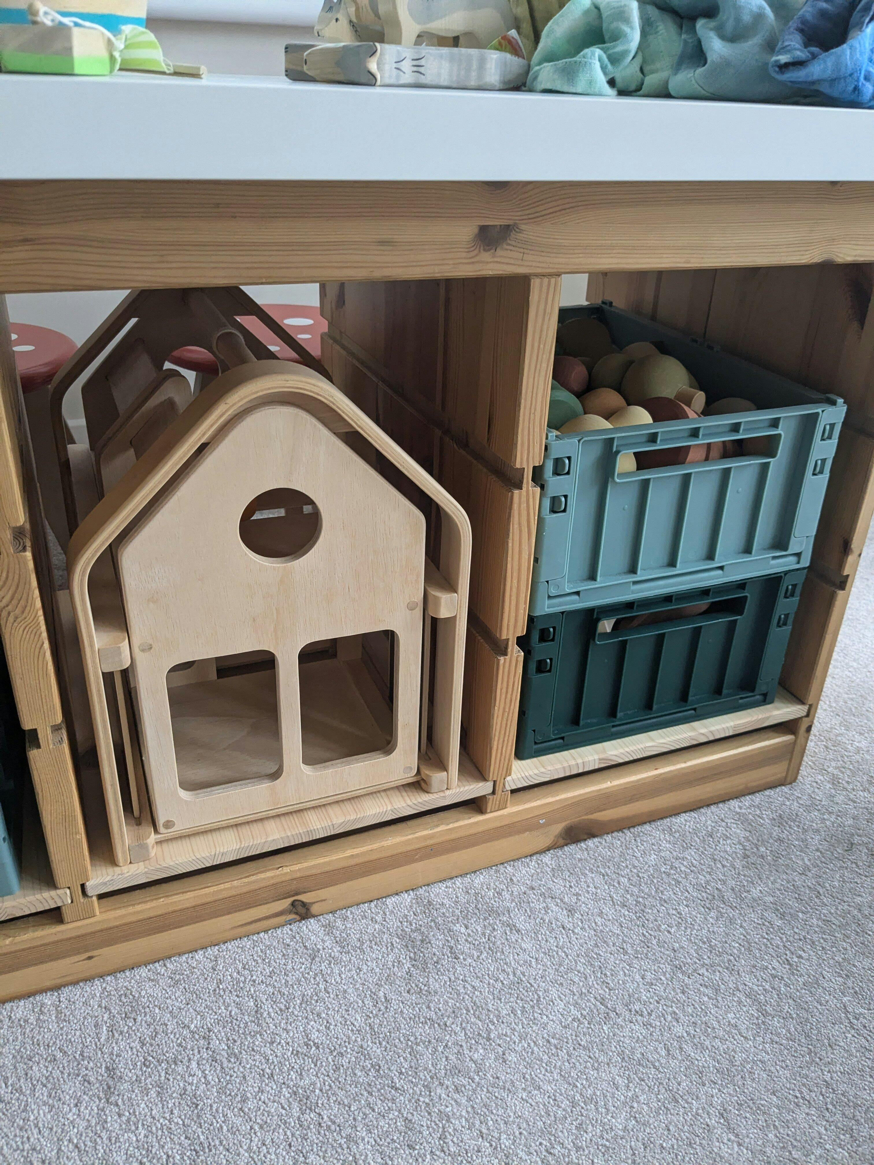 This dolls' house is made from kiln-dried, natural rubberwood. It measures 24.5cm x 36cm x 32.4cm when compartments are slid into one.