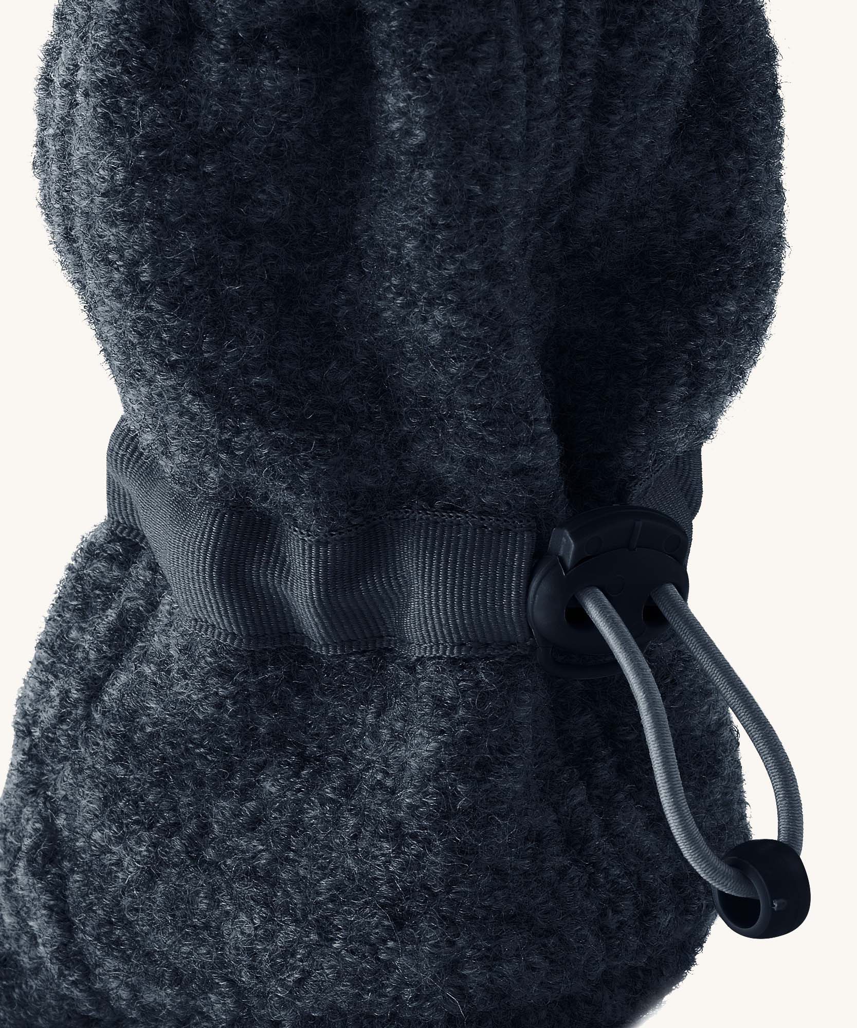 Mamalila Baby Wool Booties - in navy blue. Baby booties made from upcycled boiled wool available at Babipur. Photo shows elastic pull string ankle fastening
