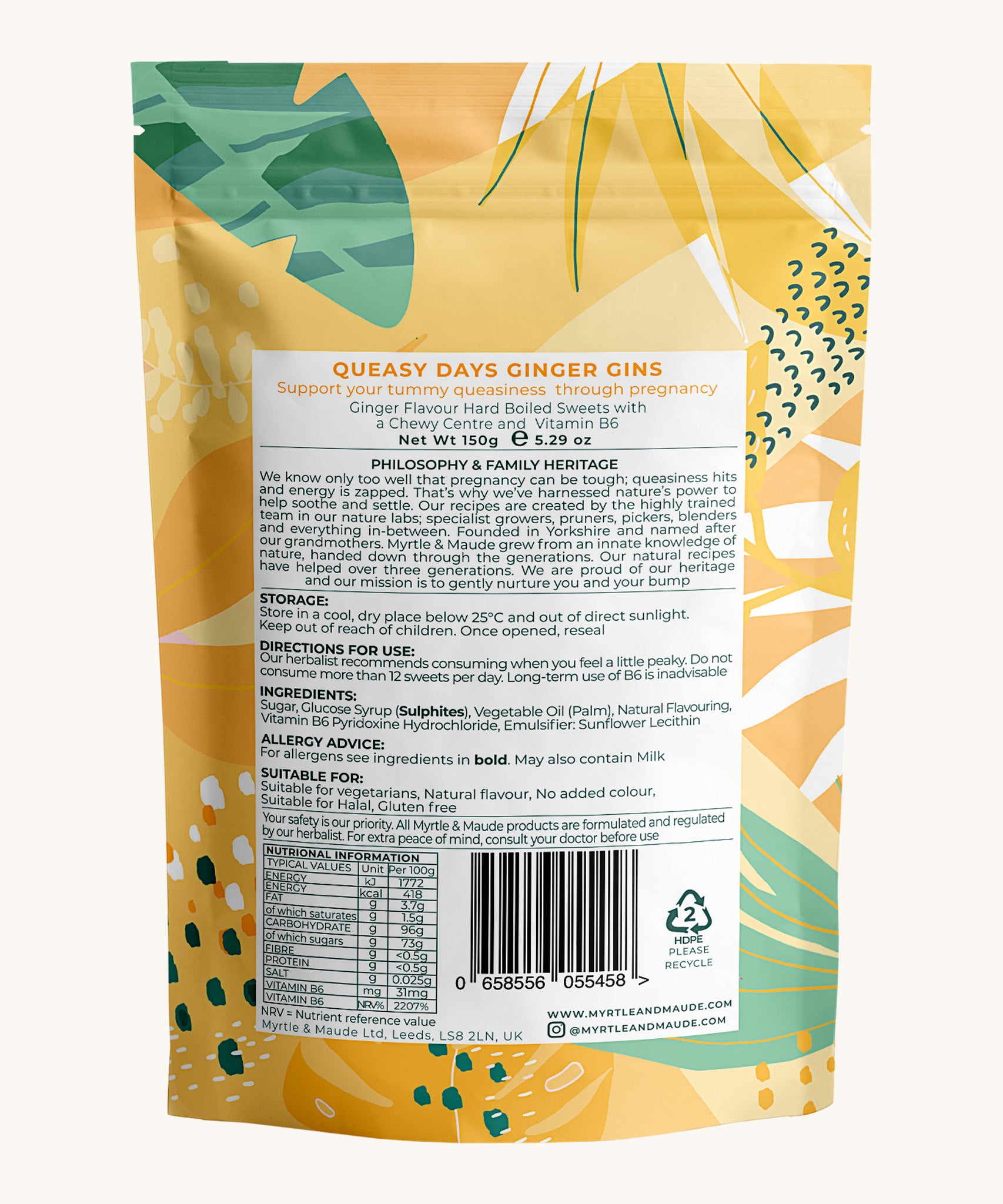 Myrtle & Maude Morning Sickness Ginger Gins are ginger flavoured boiled sweets with a chewy centre, offering relief from nausea, and enriched with Vitamin B6. These ginger sweets will help settle your stomach, are vegetarian, and are crafted traditionally in the UK.