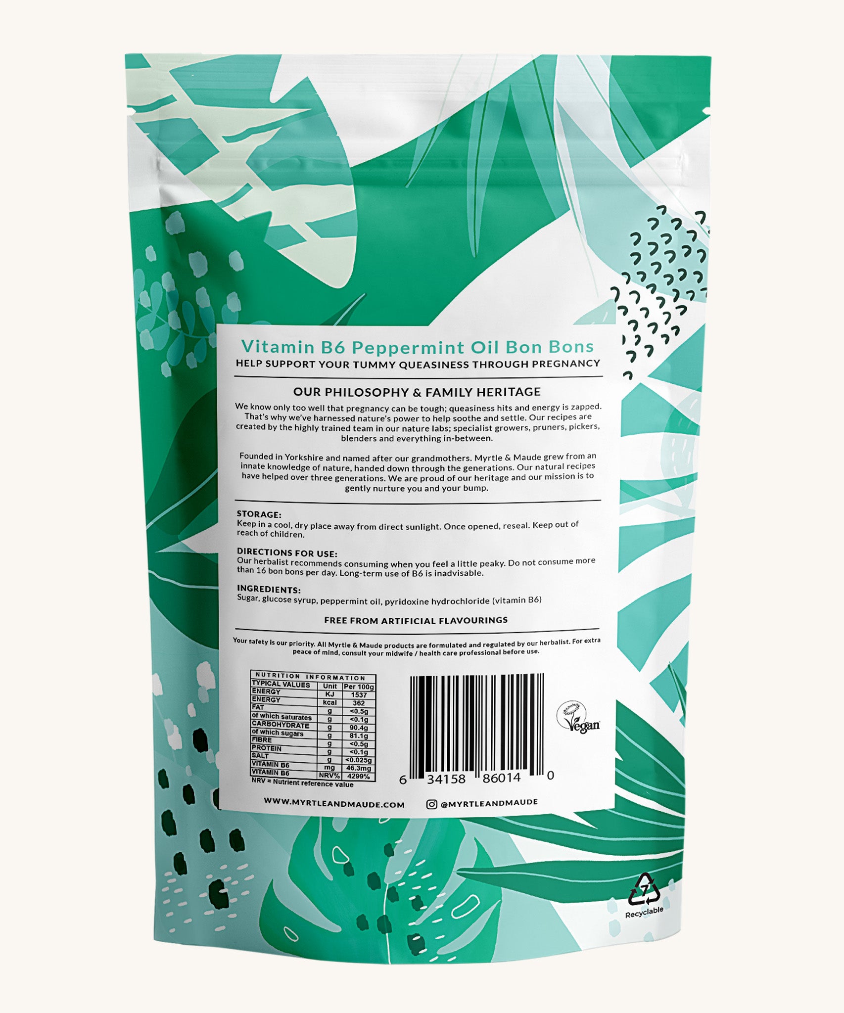 Myrtle & Maude Morning Sickness Peppermint Bon Bons offer a refreshing relief from Morning Sickness and nausea, enriched with Vitamin B6 and natural peppermint oil. These melt-in-the-mouth bonbons are Vegan certified, and are crafted traditionally in the UK.