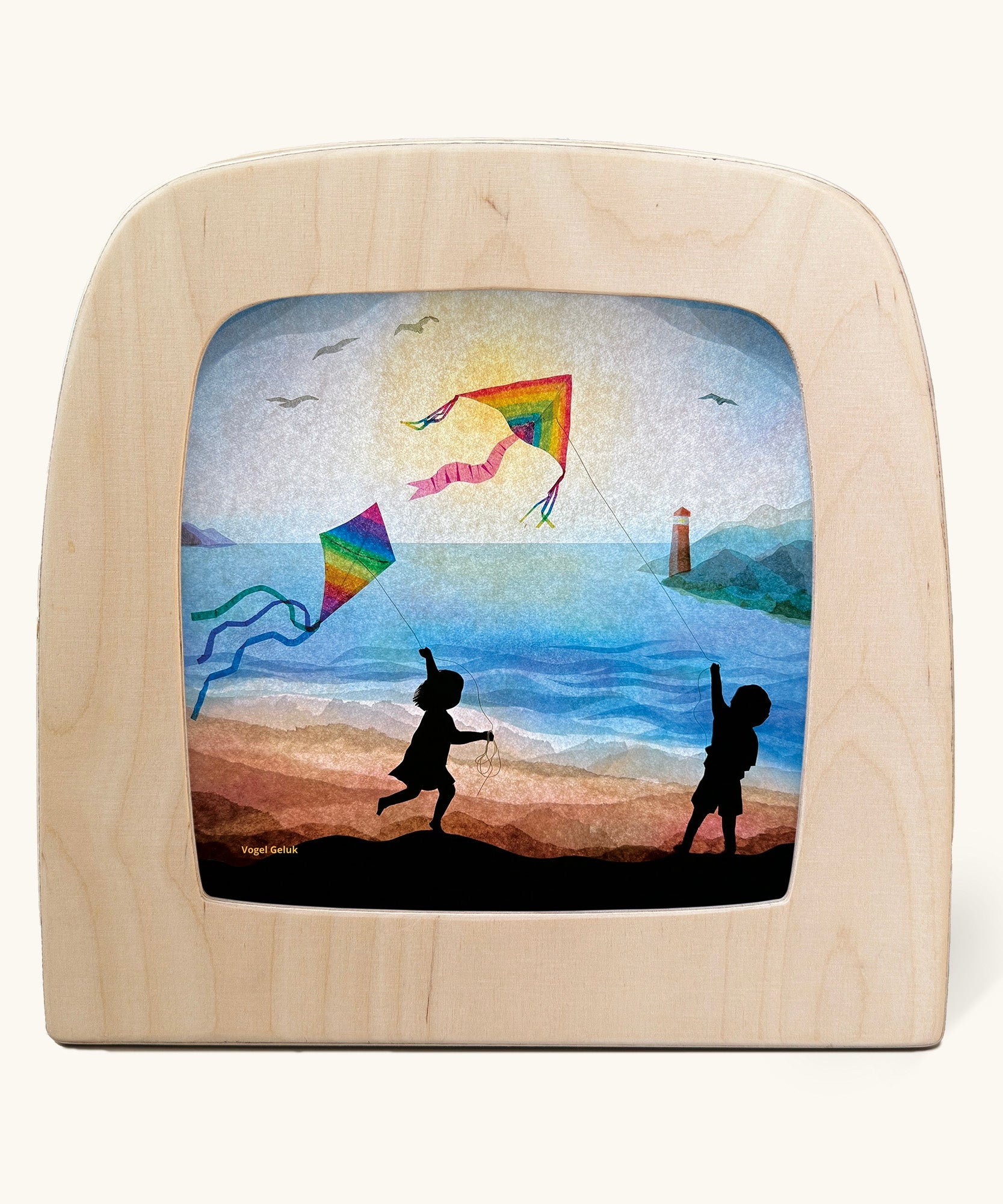 Choose from a range of Magic Lamp Silhouettes created by Linda Lammerts van Bueren of Vogel Geluk, each designed for use witha Toverlux Magic Lamp or Window Frame. These translucent artworks glow beautifully when illuminated, revealing bold, dark silhouettes set against luminous backgrounds, reminiscent of figures outlined by a glowing sunrise or sunset.