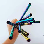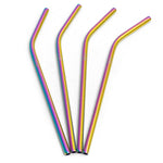 A pack of four reusable stainless steel straws in a cool iridescent rainbow colour from Elephant Box, with a slight bend at the top for ease when drinking and complete with a carry pouch and cleaning brush.