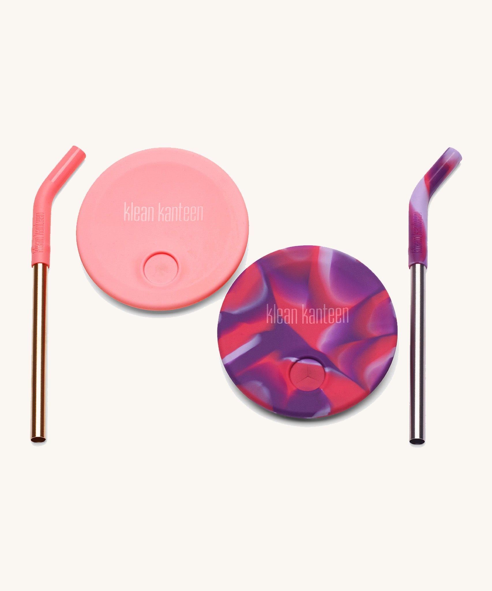 Close up of the Klean Kanteen removable kid cup straw lids in the pink tie dye colour