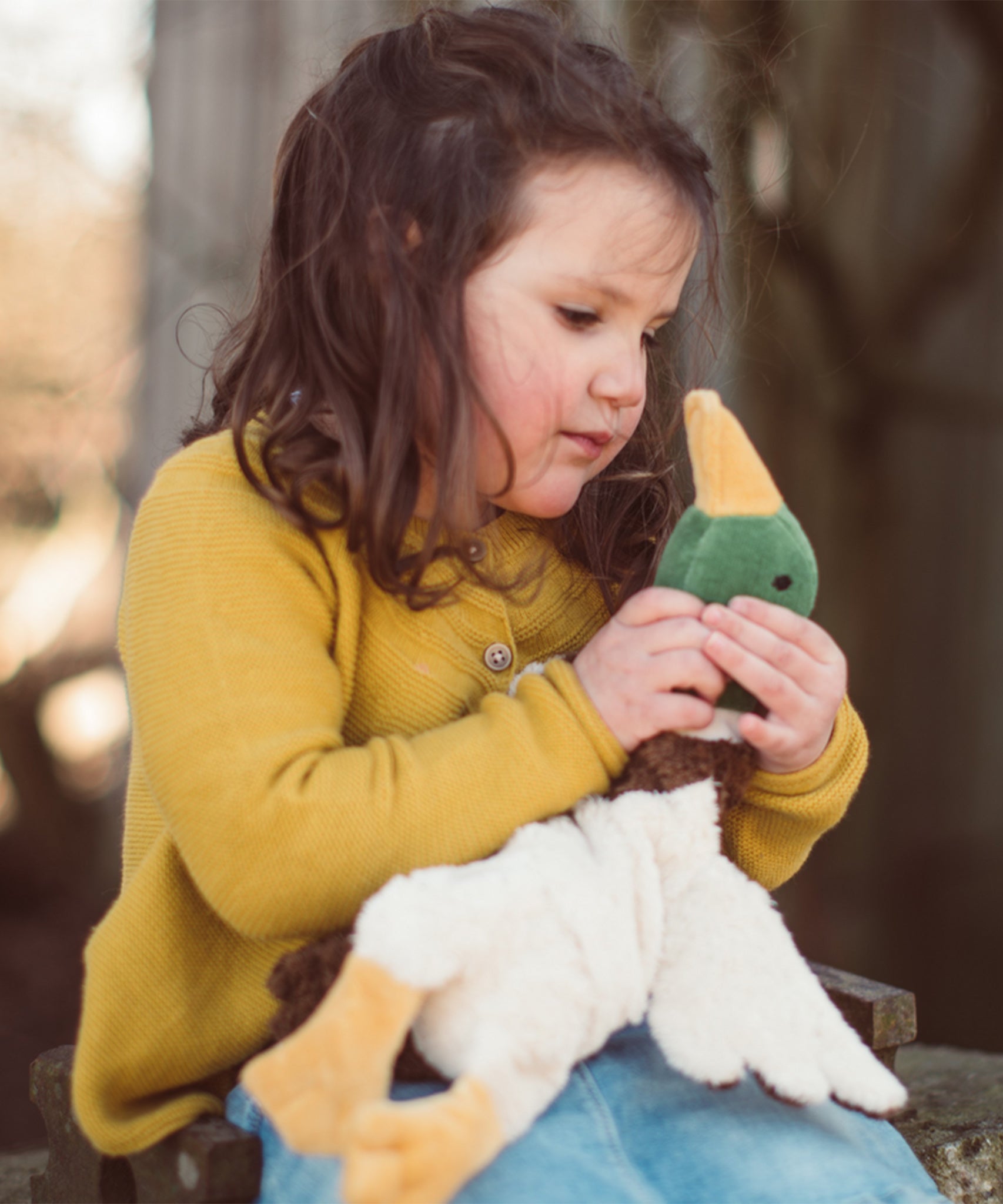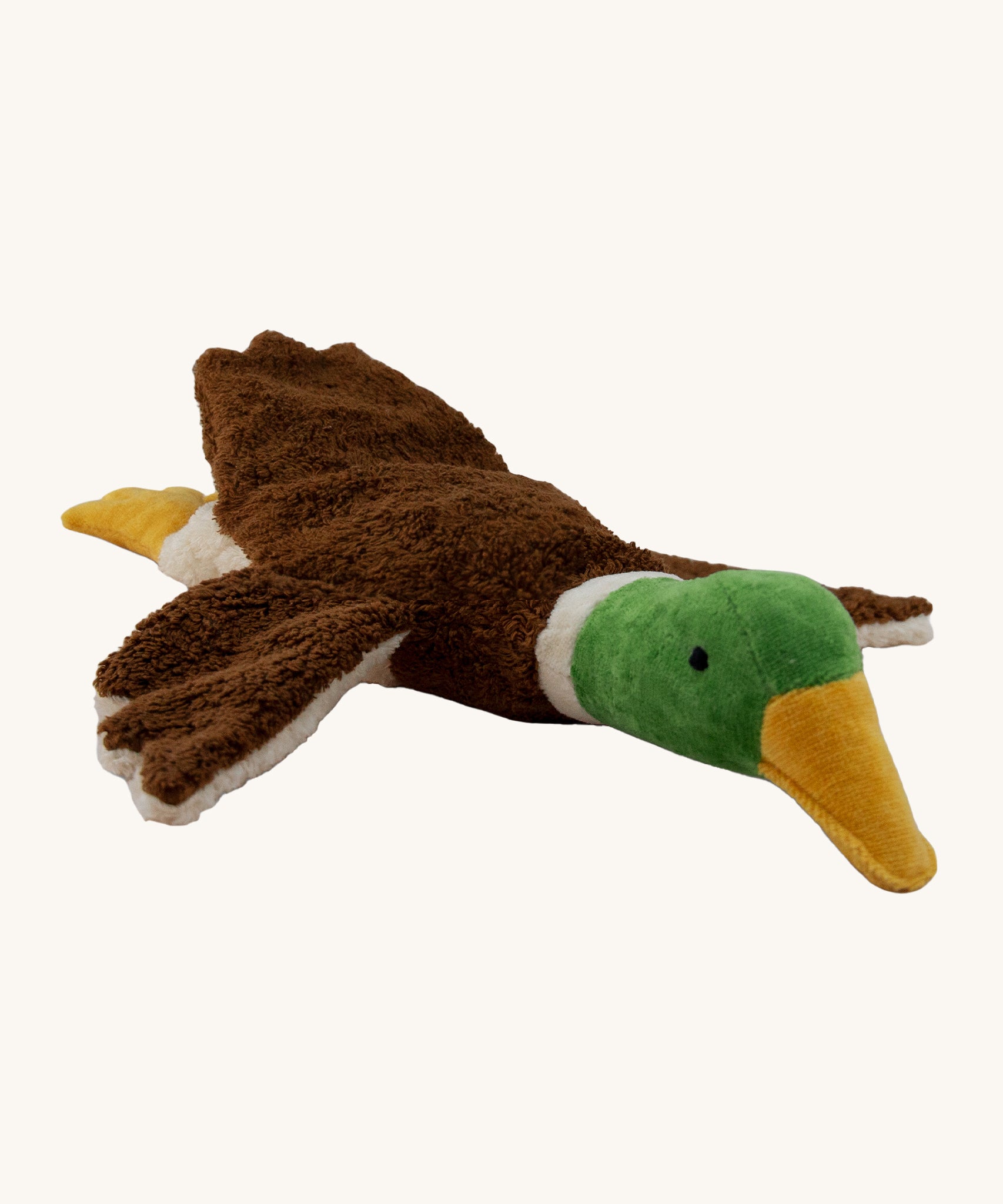 The perfect huggable bedtime companion and playtime friend for little children. With soft and strokable plush brown fur, green head, velvety yellow feet and beak, large wings and sweet embroidered facial details, this little vintage-style duck stuffed toy will become a cherished companion through childhood. The removable heat cushion can be gently heated and returned to the soft toy, making a comforting and warming pillow for cuddling on the sofa. Alternatively, it can be chilled down in the fridge to provide relief on hot nights.