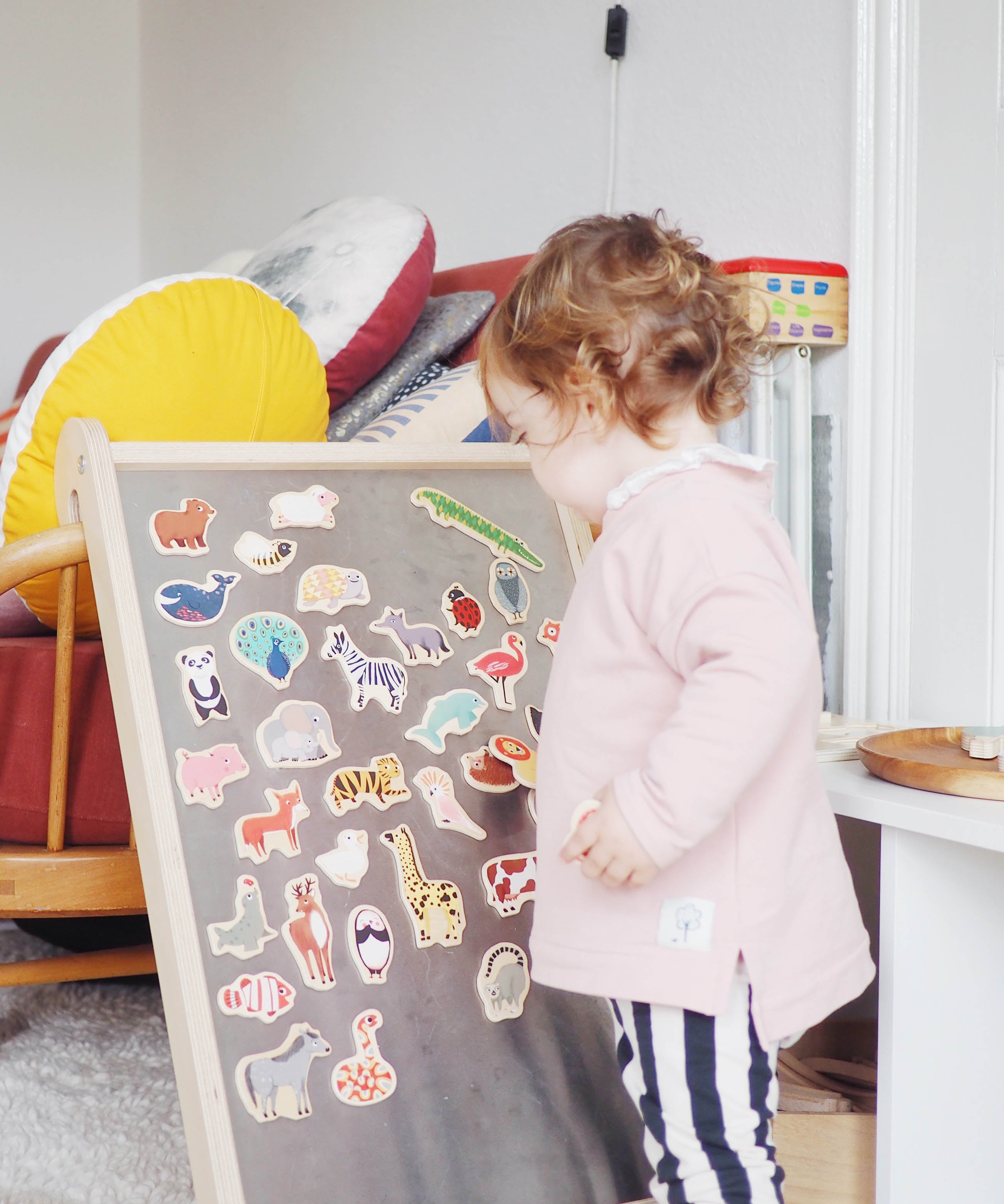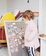Triclimb-wooden-magnetic Biri board hooked on a Triclimb pikler climbing frame  in a playroom showing various magnetic pieces on the board.
