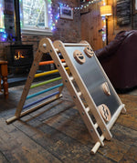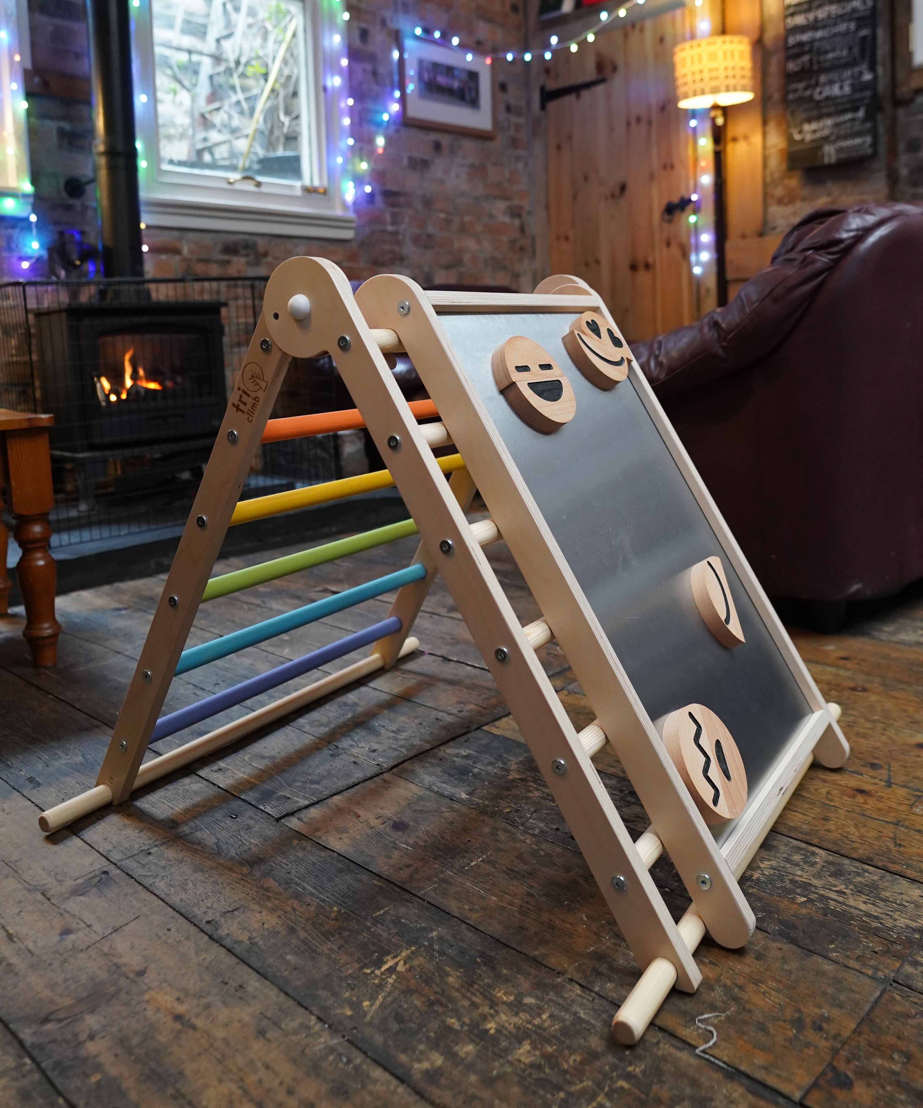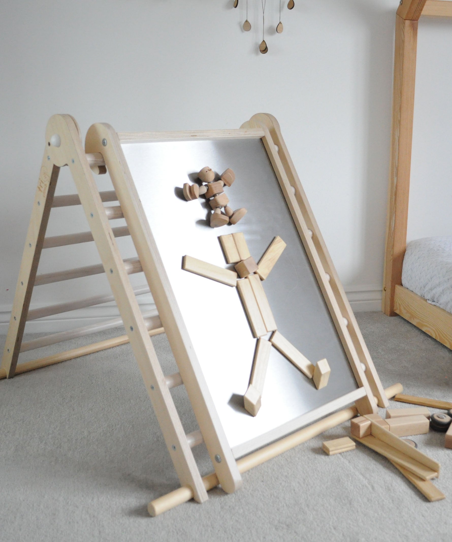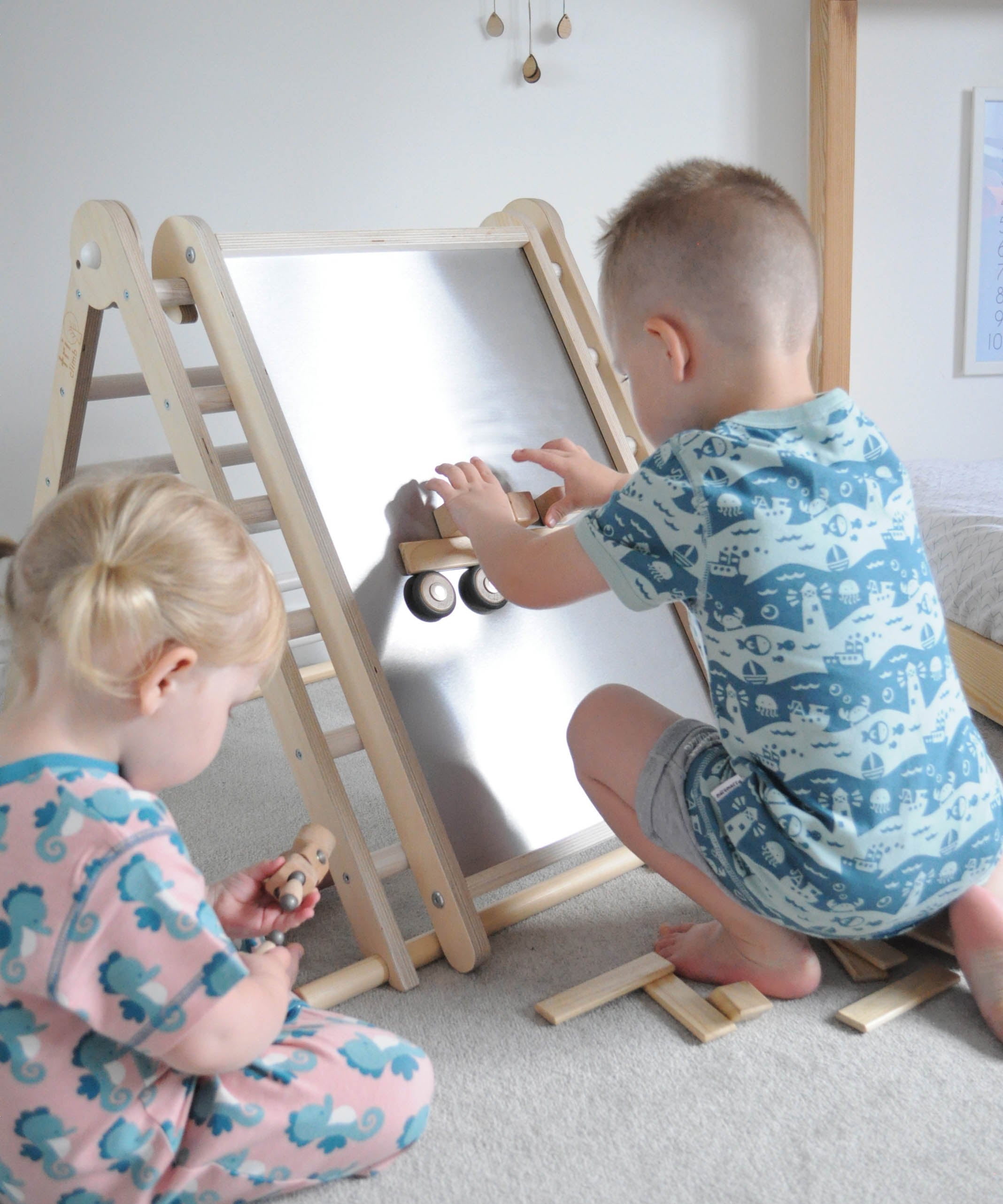 Triclimb Biri is a wooden board with a brushed stainless steel surface that hooks into any of the rungs of your Triclimb to create the desired angle. Magentic toys stick to the steel surface allowing children to make patterns and pictures and even ball runs. Use wipeable markers to draw, wipe and draw again. The brushed finish also makes it perfect for chalk drawing. Remove the Biri from your Triclimb, lay it on the floor and you have a large play tray.