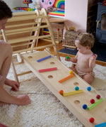 Miri as a Play Surface or Ball Run: When placed flat, Miri becomes a versatile play platform. The holes and Miri sticks can be used together to make marble runs, ramps, and small-world play scenes. It’s ideal for open-ended play, block building, and experiments with movement and gravity.