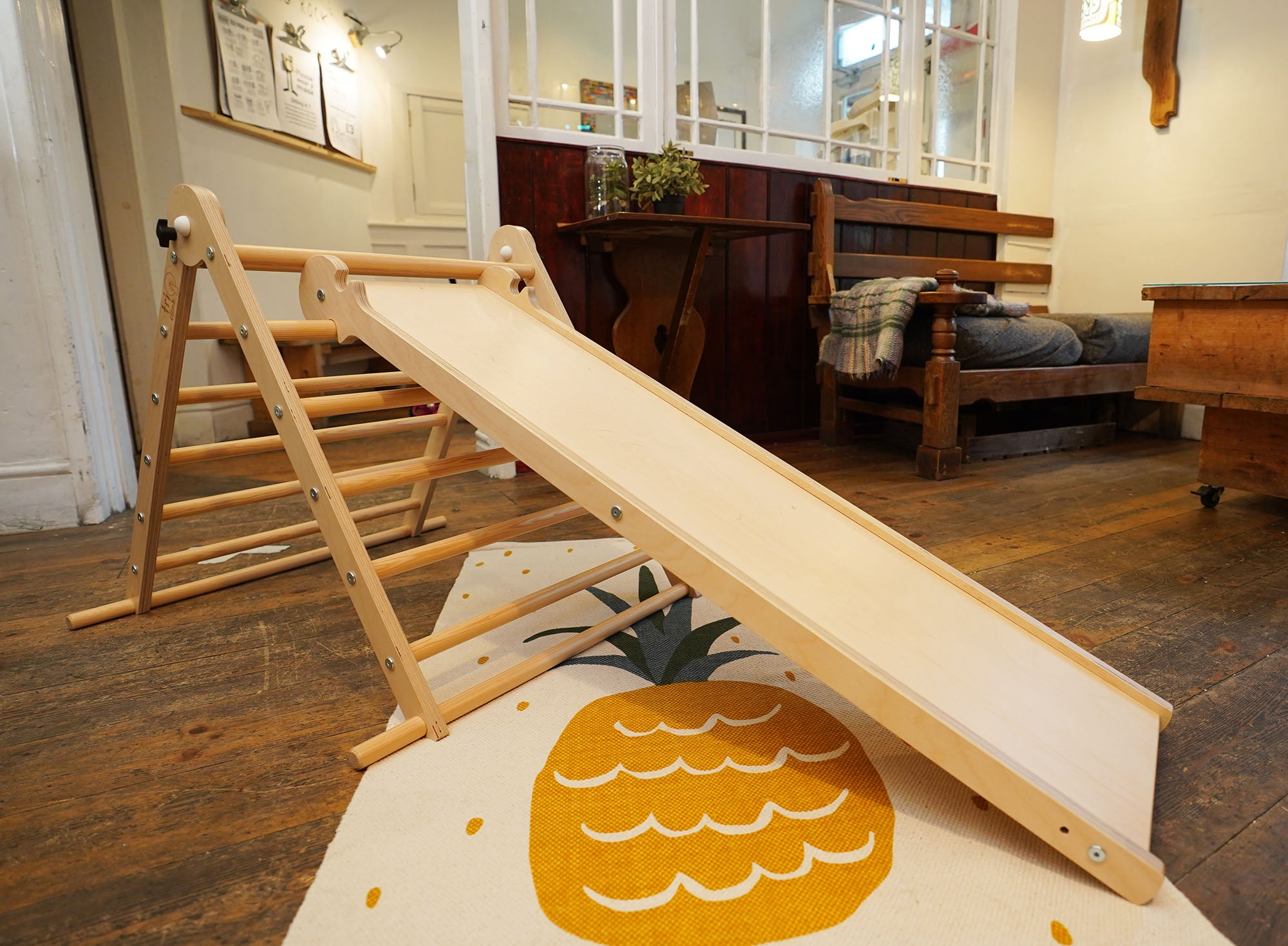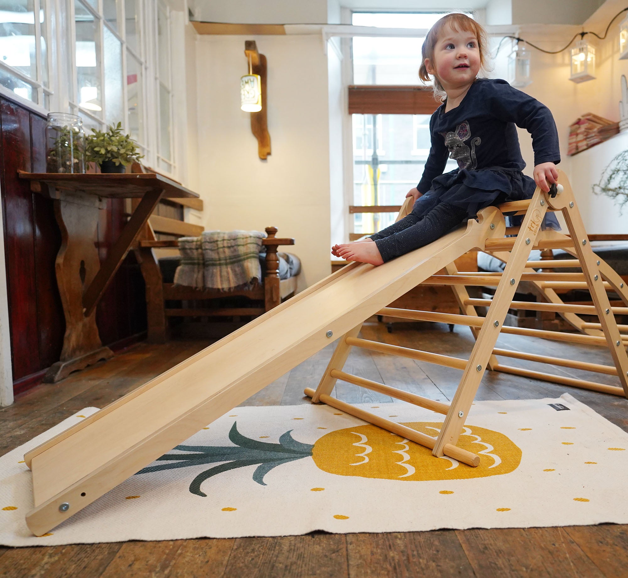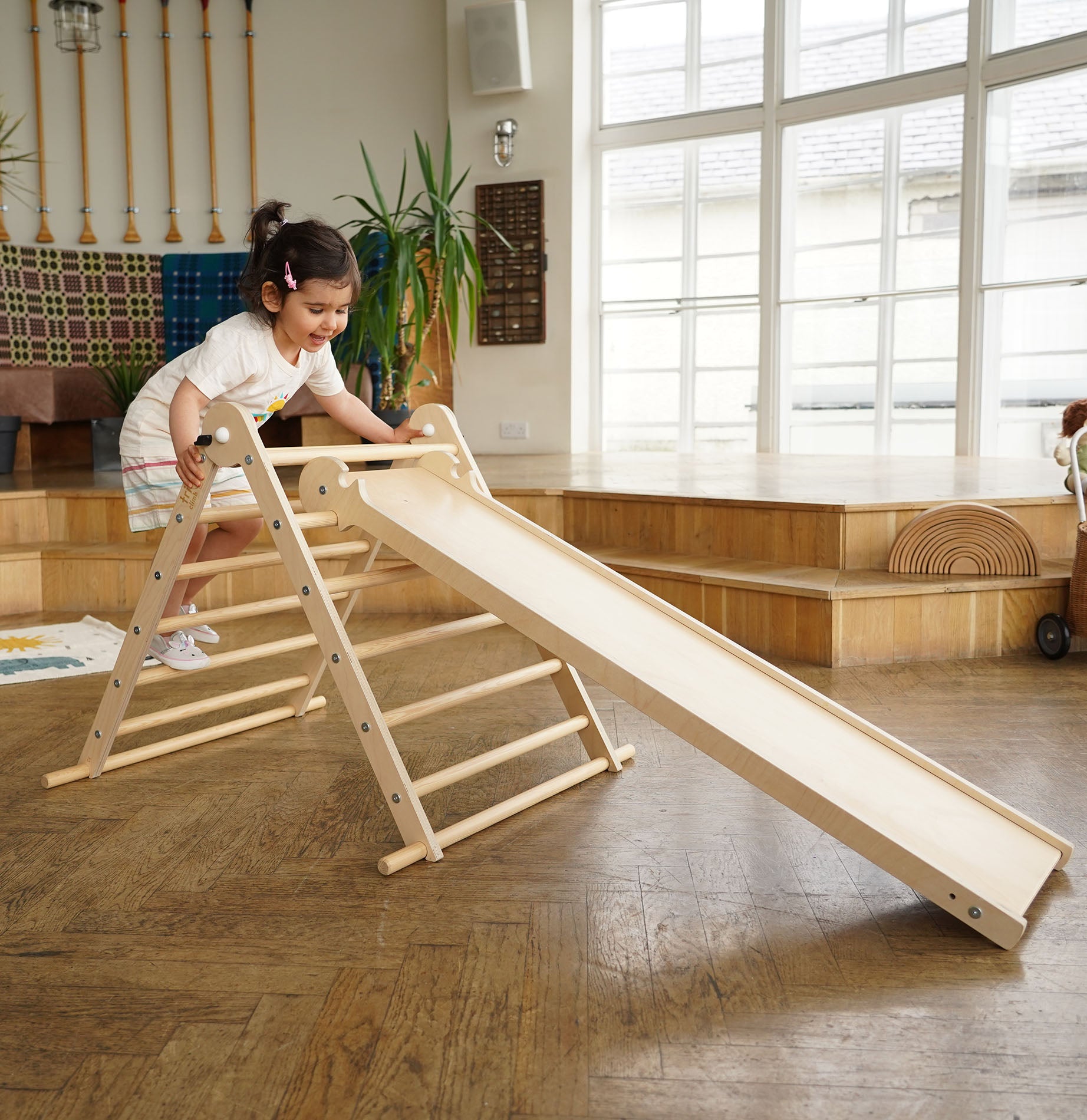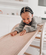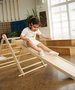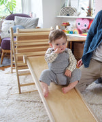 The Miri is a reversible wooden slide, ramp, climbing wall, play surface, and bridge for children. It connects securely to your Triclimb triangle (sold separately) without any tools, creating a stable platform for climbing, sliding, balancing, and imaginative play.